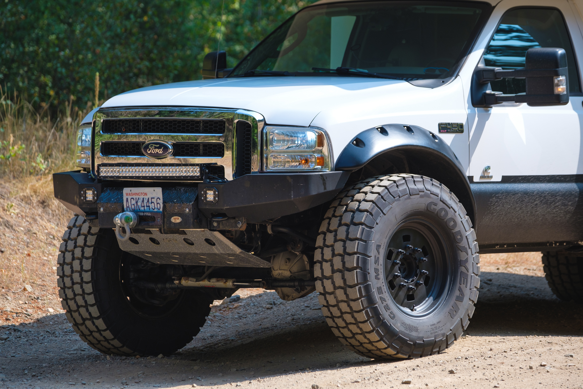 With such a sizable investment now under the hood, it made sense to add additional protection, so Carl installed a modular ASFIR bumper. This replaced the original Herd Alloy unit that came with the truck, which made sense since it wouldn’t match the new fender line or hold a winch anyway. Inside the ASFIR, a 15,000-pound Milemarker winch stands ready to haul this beast of a truck out of sticky situations, and a Masterpull synthetic line with Factor 55 ProLink is there to help.