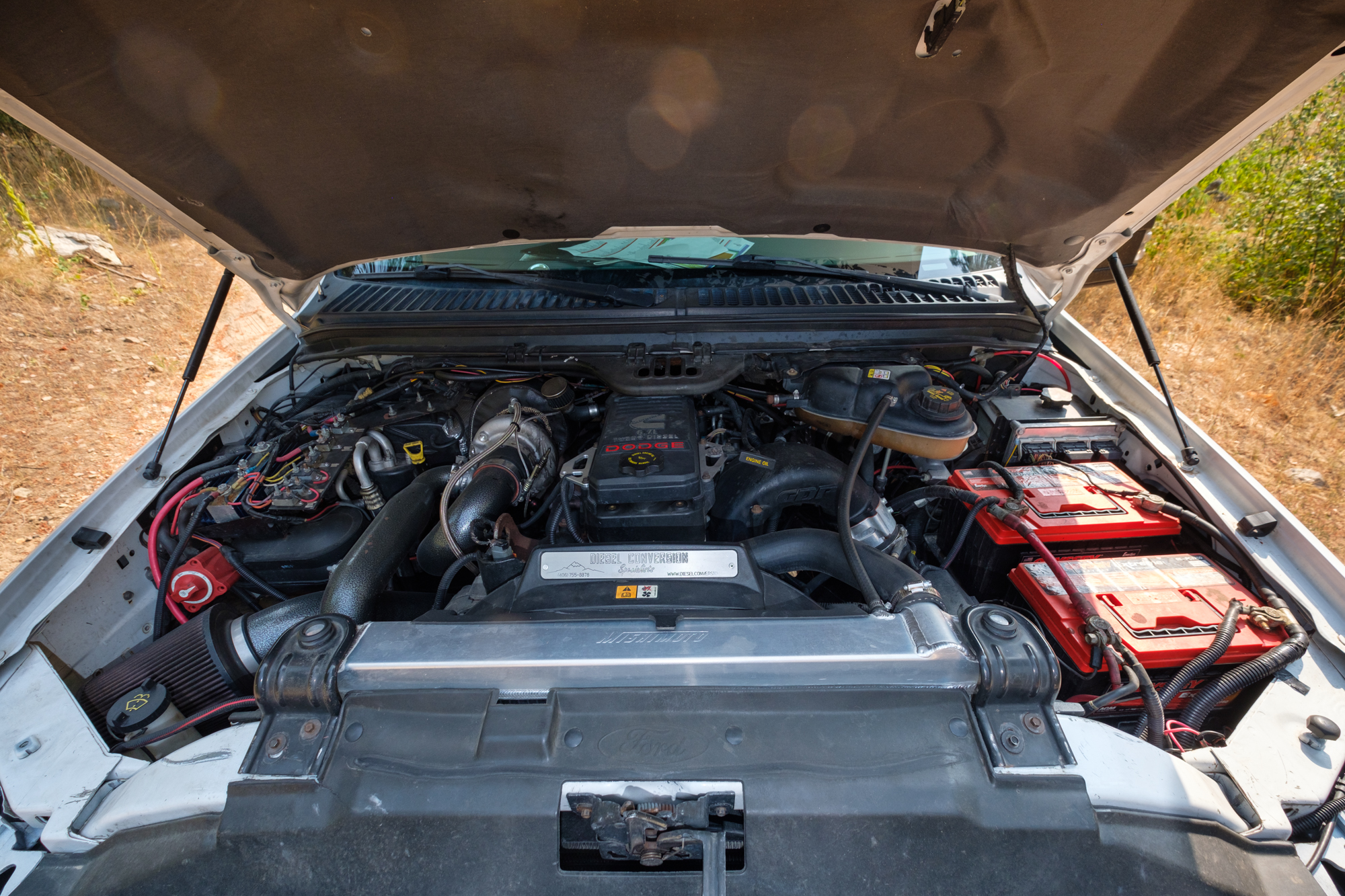 Carl turned to the team at Diesel Conversion Specialists in Kalispell, Montana, for a full Cummins 6.7L swap with new head studs and a banks intercooler. They chose an SCT programmer for additional power, edge gauges for monitoring, and dual Odyssey batteries for cranking. Supporting this new motor is an ATS built 5R110 Torq-Shift automatic transmission with an ATS high-capacity aluminum transmission pan and five star torque converter. While purists may cringe at the mating of a Ford and Cummins, the Nitro team had excellent luck with the change and found it solved all of the engine issues that plagued the Xcursion before. They did want to add just a little extra something though, and Dynomite Diesel Performance had just the thing: twin turbos. Carl states that this was largely done for reliability, quick throttle response, and cooler EGT’s, and that makes good sense to us. We’ll just chock the 1,110 pound feet of torque up to being a happy accident.