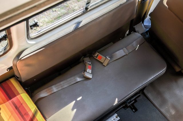 Goose Gear’s handiwork extends beyond the cabinetry and floor. They also made the custom upper sleeping platform that integrates into the new roof. Their setup keeps the top of the vehicle light and uses gas struts to raise and lower the bed. My favorite feature is the 70/30 split in the platform, which enables the owner to drop the 30 portion of the panel down to the lower part of the vehicle to make a second bed. This setup is not only useful for kids and guests but also stealth camping with the top down in cities or foul weather. Both the bed and lower bench are covered in matching custom fabric with memory foam cushions. They’re quite comfortable, but not nearly as much so as the two Scheel-Mann Vario seats Carl put in the front of the Trakka.