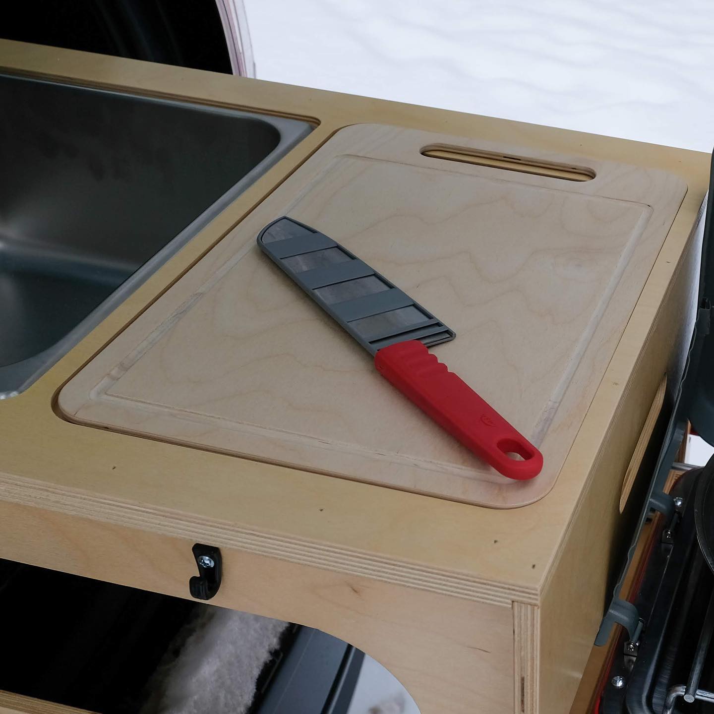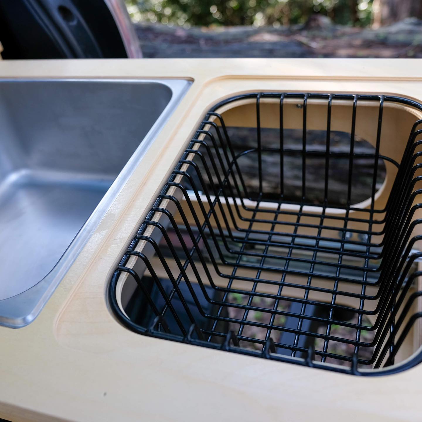 The vehicle-mounted kitchen is the perfect addition to any overland or adventure-mobile build: With an adjustable specialized strap system, it is as simple to install as hooking in a few ratchet straps and requires no tools or permanent modifications to your vehicle. The self-contained box pulls out in two sections on heavy-duty slides. The system is rated for up to 200 pounds and extends out of the trunk to provide an additional four feet of food prep, cooking, and clean up space. The first section hosts a stainless-steel wash basin and a sunken drying rack topped with a custom-fit bamboo cutting board, both double as space to store cookware. The second drawer section leaves room for a two-burner stove unit and is compatible with many popular options. The system also provides four hooks to hang accessories and the top surface of the frame supports water tanks with a spigot.