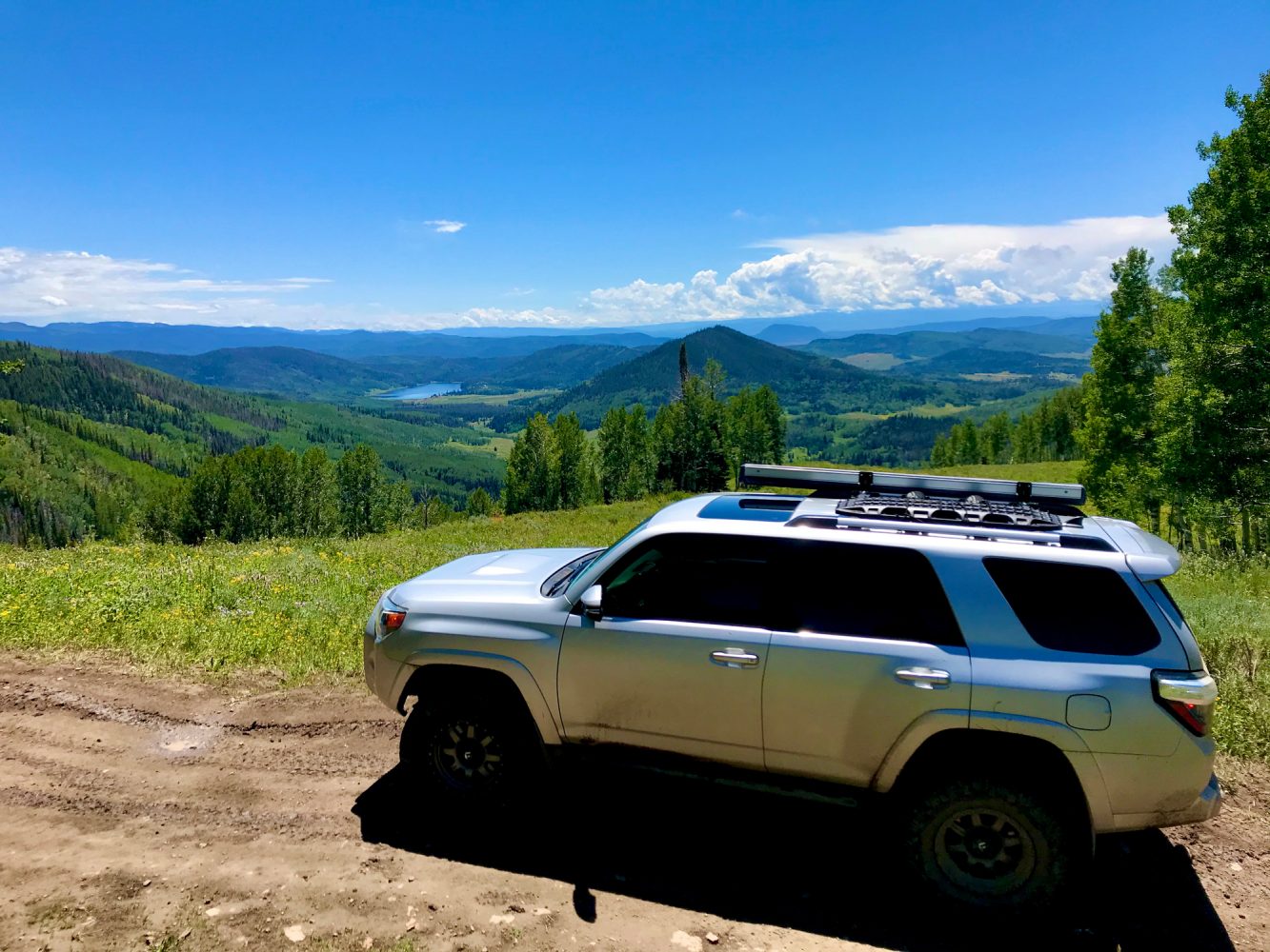 Sipping on some hot coffee, I watched the sunrise and began my day. Today’s track was the Ellis Jeep Trail, and if the trail and weather permitted, I was going to cross over into Wyoming. As I cruised up Whiskey Park Road, FS 500, it began to rain a bit. I hooked a right on Big Red Park and began my trek up the trail. I knew from my research that this track was going to get difficult. Scanning the mountains around me and my maps, I could tell that this was steep. With Mount Zirkel Wilderness to my east, I approached the ridgeline that became ever increasingly super tight and twisty. Fallen trees were everywhere. The rain poured now, as if right on queue for the most technically demanding sections. With more down trees than I could count, I gripped the steering wheel harder. Getting slicker by the second, the rocks got bigger and multiplied. Boulders joined the party. I crawled my way through, and I could not help but think this unforgiving, menacing trail could be where I incurred some serious vehicle damage. Taking my time out here alone in heavy rain, I safely made it through in 4Low. As the trail crested and began to descend steeply, I flipped on the locker to assist with downhill control. Utilizing the most out of my low-range gearing and rear locker, I pulled out of this one like a mountain goat. Once I fully cleared the hardest part, I continued approaching the Wyoming state line. The trail went from very rocky to placid and completely rocky to red dirt and pebbly. I crossed over into Wyoming, continued up FR 496, and stopped at Hog Park Reservoir for a bit, taking in the crisp air and beautiful water on this overcast day. With a cold, wet wind sweeping through, I continued on my journey, traveling around the reservoir on FR 550, and soon I was heading south. Once back in Colorado, I dropped in on the Hahns Peak Trail and entered an expansive trail network that presented multiple off-road trail options. I made my way around Twin Mountain and continued onto Farewell Mountain. The rain eased up, and the sun quickly began to shine through. Beauty was pegged at the abundance setting. There were some rocky, off-camber sections with some pretty serious angles as I slowly descended into a valley. I took everything nice and slow and found what remained of Old Farewell Mine. I descended into a relatively flat area full of wildflowers that had 360° views surrounded by mountain peaks. I reviewed my options. Next up was Buffalo Pass. I topped off in Hahns Peak and grabbed a few supplies. Upon reaching the trailhead, a storm looked to be rolling in. As I headed onto the trail and ascended the initial round of ridges, the leaves were blowing with intensity. The rain picked up a bit, and I came over a hill with the wind and rain blowing with ferocity. I noticed someone’s shade tent tumbling in the wind. I hopped out, caught it, and stopped it from moving. With the owners nowhere in sight, I secured the runaway tent utilizing some nearby rocks, figuring the owners would be by as soon as the weather cleared. After a few more minutes on Buffalo Pass, the weather did clear. I continued around some gentle bends in the road and came upon a ridge camping spot with an incredible view. From this perch, I could see the owners in the midst of retrieving their lost tent. Happy to know I helped, I took to setting up my camp for the night. Once settled in, I was lucky to be right on time for a wonderful Steamboat Springs sunset.