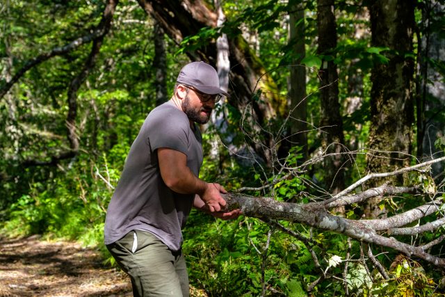 You’ll find yourself starting the dirt portion of the drive on the wide logging roads of the cape’s interior. The surface is dusty and smooth, enabling you to cruise along at a fast pace without the worry of large rocks or dips. It is important to use caution, though, as you’re sure to encounter massive trucks carrying lumber, and if the season is right, Christmas trees, of which the province exports roughly one million every year. These dirt thoroughfares span across many portions of the island and can be used to get around quickly, but it’s the surrounding access roads that you’ll want to investigate—a web of interesting and unpredictable trails. Many of them are snowmobile tracks in the winter and become so narrow and technical that you can’t make it through. Others, like the one we took down to the tiny town of Big Intervale, are a joy to explore and will pose a lively challenge. Just come prepared with a chainsaw if you have it, or an ax and gloves if you don’t; downed trees can be a big challenge.