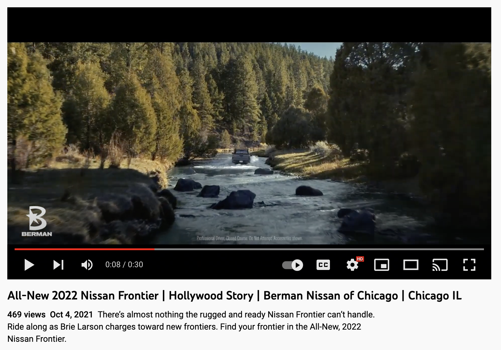 Quick cuts of rocks tumbling, water splashing, and dirt flying meld together as actress Brie Larson navigates a 2022 Nissan Frontier pickup over rough, off-pavement terrain. A fast, aggressive electric guitar riff screams in the background as the truck enters a brown-hued stream, waves rippling beneath the tires and chassis, windshield wipers on high as water moves over the hood. The shot goes wide, revealing a river surrounded by evergreen trees and a bright blue sky. The Nissan trundles upriver, the 3.8-liter V6 engine growling as waves roll over the truck tires. “The hero prevails,” Larson says, glancing at the camera confidently. Rock music and blood pressure rage. Man (or, in this case, woman) and machine continue to dominate the natural world. Driving this truck is exciting, cool—a thrill.