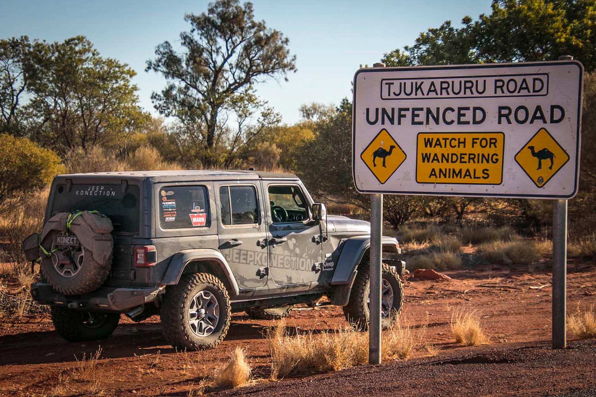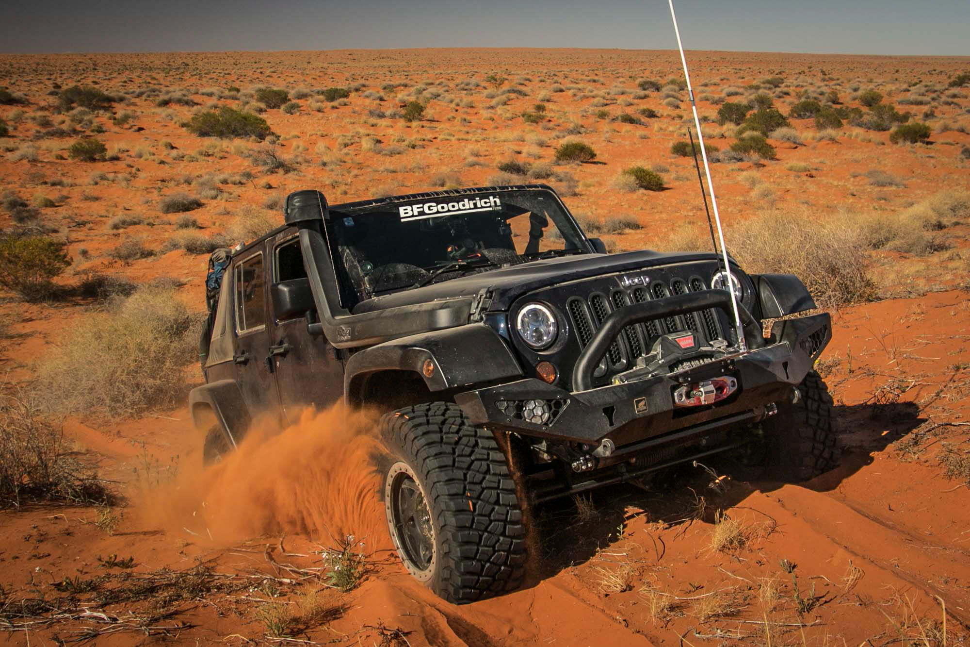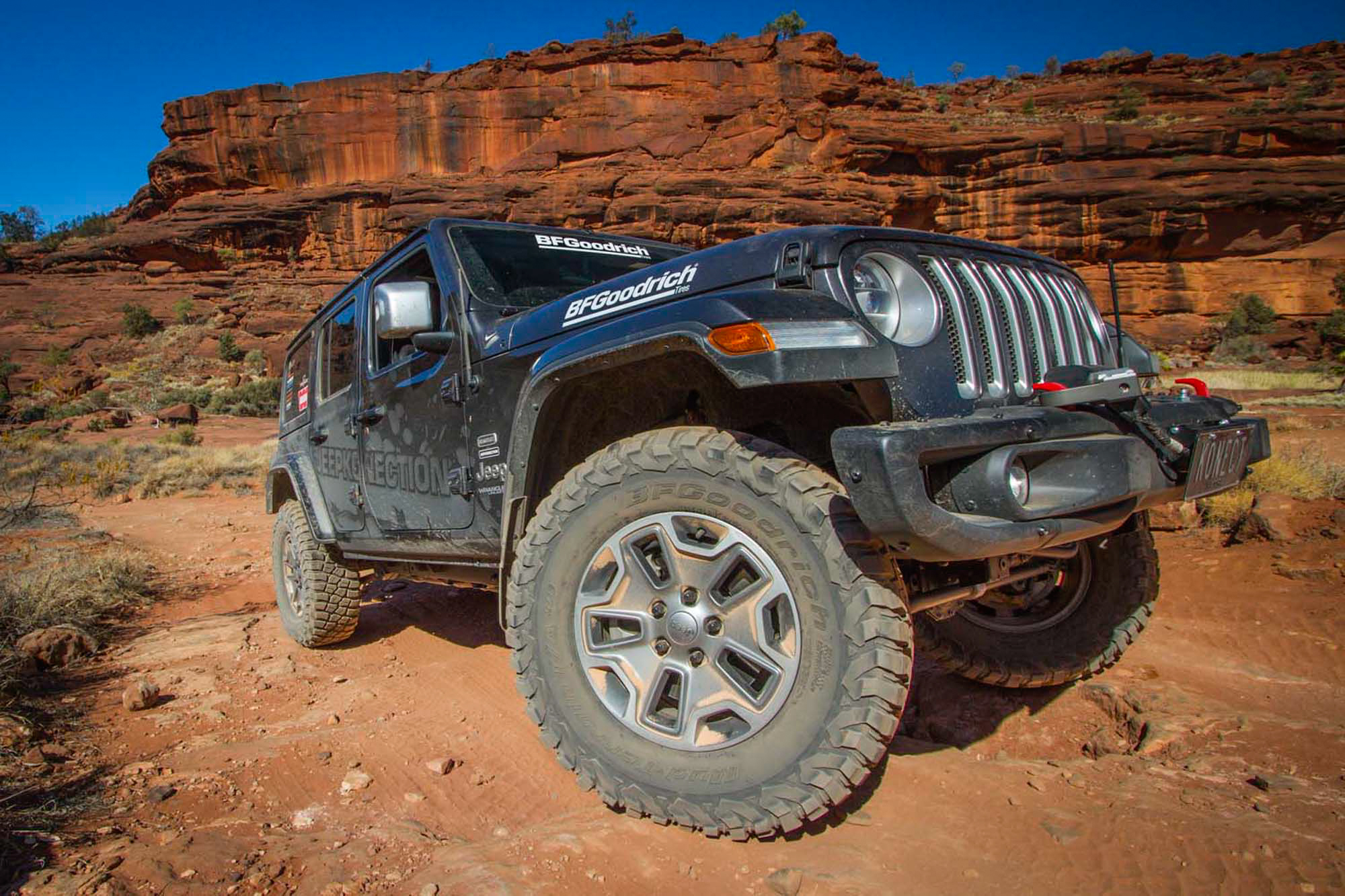 Above: The BFGoodrich East-West Australia fleet included Jeep Konection’s 2019 Wrangler JL Overland. It was upfitted with a Warn Zeon 10-S winch with Spydura synthetic line and a Factor55 Flat Link Pro thimble. Underneath are a Teraflex 2.5-inch lift and Falcon adjustable shocks, Long Range Automotive auxiliary fuel cell, and Dana 44 axles with ARB air lockers. Other tools of the trade include MaxTrax, Bestop top and floormats, an ARB compressor, Dometic fridge freezer, and Teraflex tire mount.