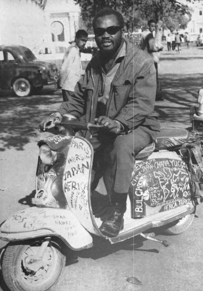 Born in Ghana, 26-year-old Olabisi Ajala developed a reputation for whizzing through perilous border crossings on his Lambretta scooter, a deluge of bullets and shouting guards following in his wake. Between 1957 and 1962, Ajala journeyed across 87 countries on his scooter, touring across North America, Eastern, and Western Europe, through Africa and Asia, and as far east as Korea, Indonesia, and Australia.