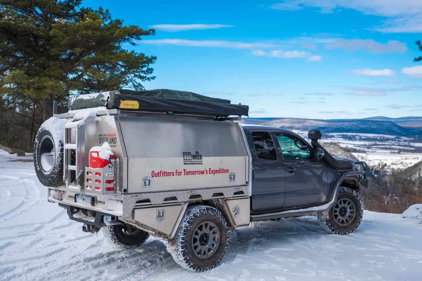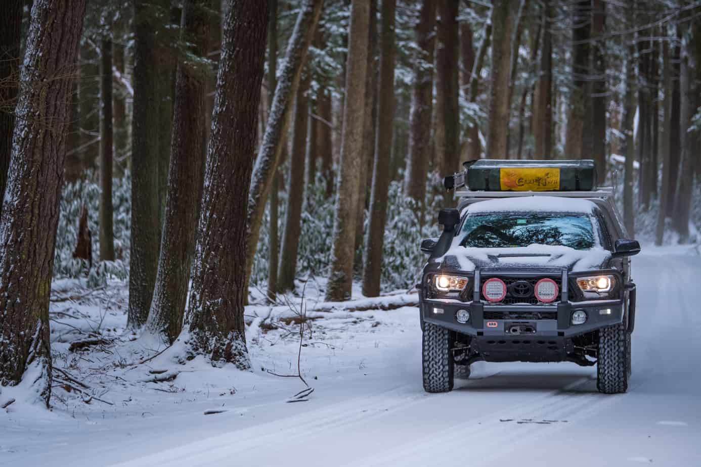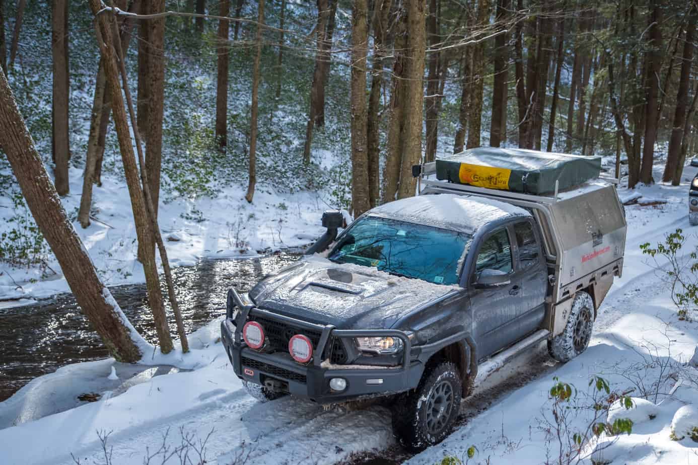 It was hard to believe that less than an hour ago we had been sipping coffee by the warmth of a fireplace and now we were deep in the woods of Pennsylvania taking photos of the Main Line Overland Tacoma. Our plan for the day was to meet up with Michael Hermann of Purple Lizard Maps and follow some of his favorite trails to see what adventures the east coast had to offer. Before long, Michael’s black Toyota Tundra rolled into view, and we set off into the snow, plowing fresh tracks as we went.