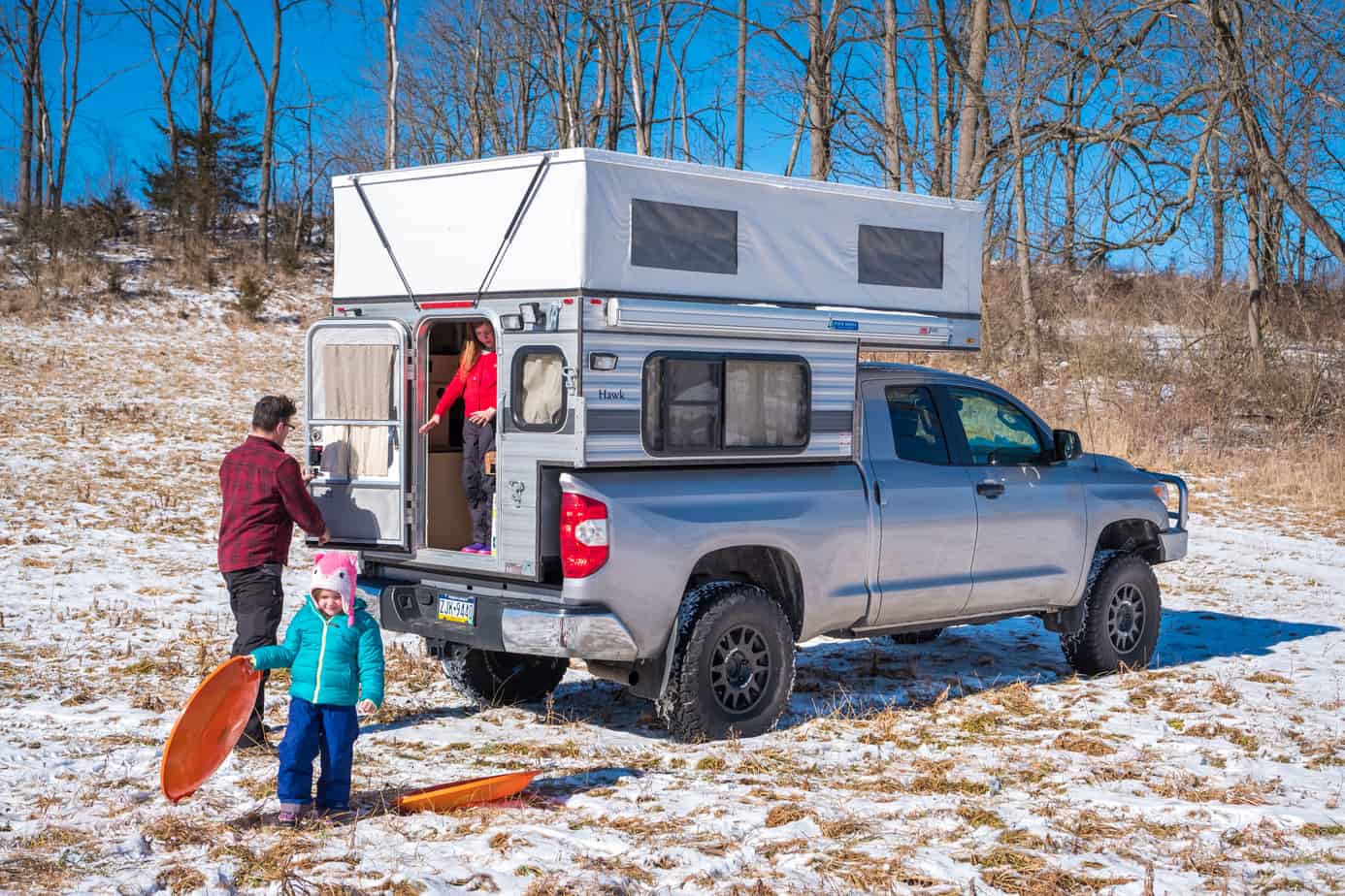 After some exploring on dirt roads and winding around farmland, we found the perfect candidate. It was tall, steep, smooth, and had a long open field at the bottom for slowing down. It also had more snow than the surrounding terrain, so we parked the truck, popped the top on the Four-Wheel camper, and cranked up the heater to a balmy 70 degrees. Before long, the four of us were darn near baking inside and we unloaded to hit the hill.