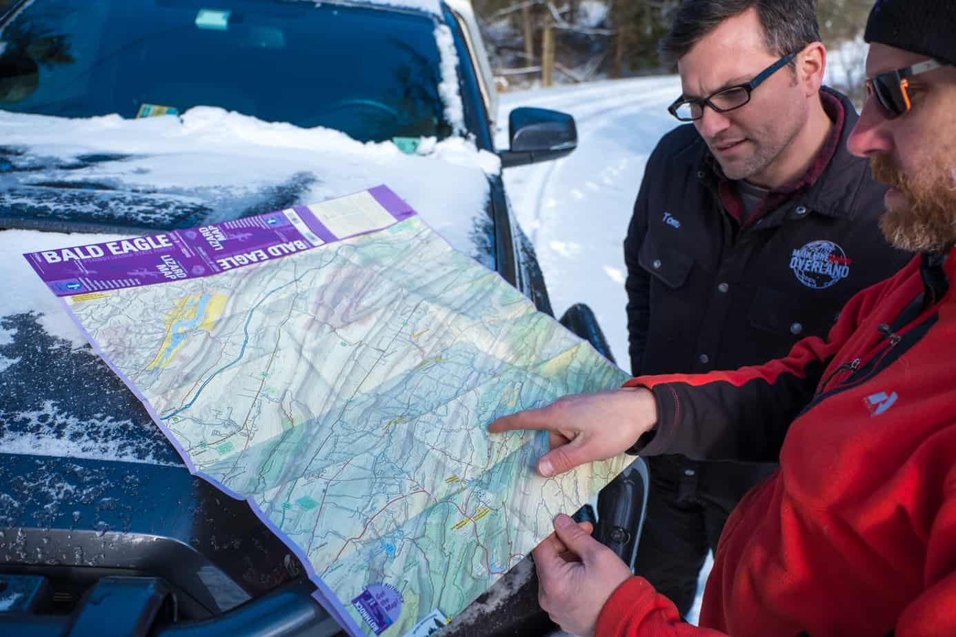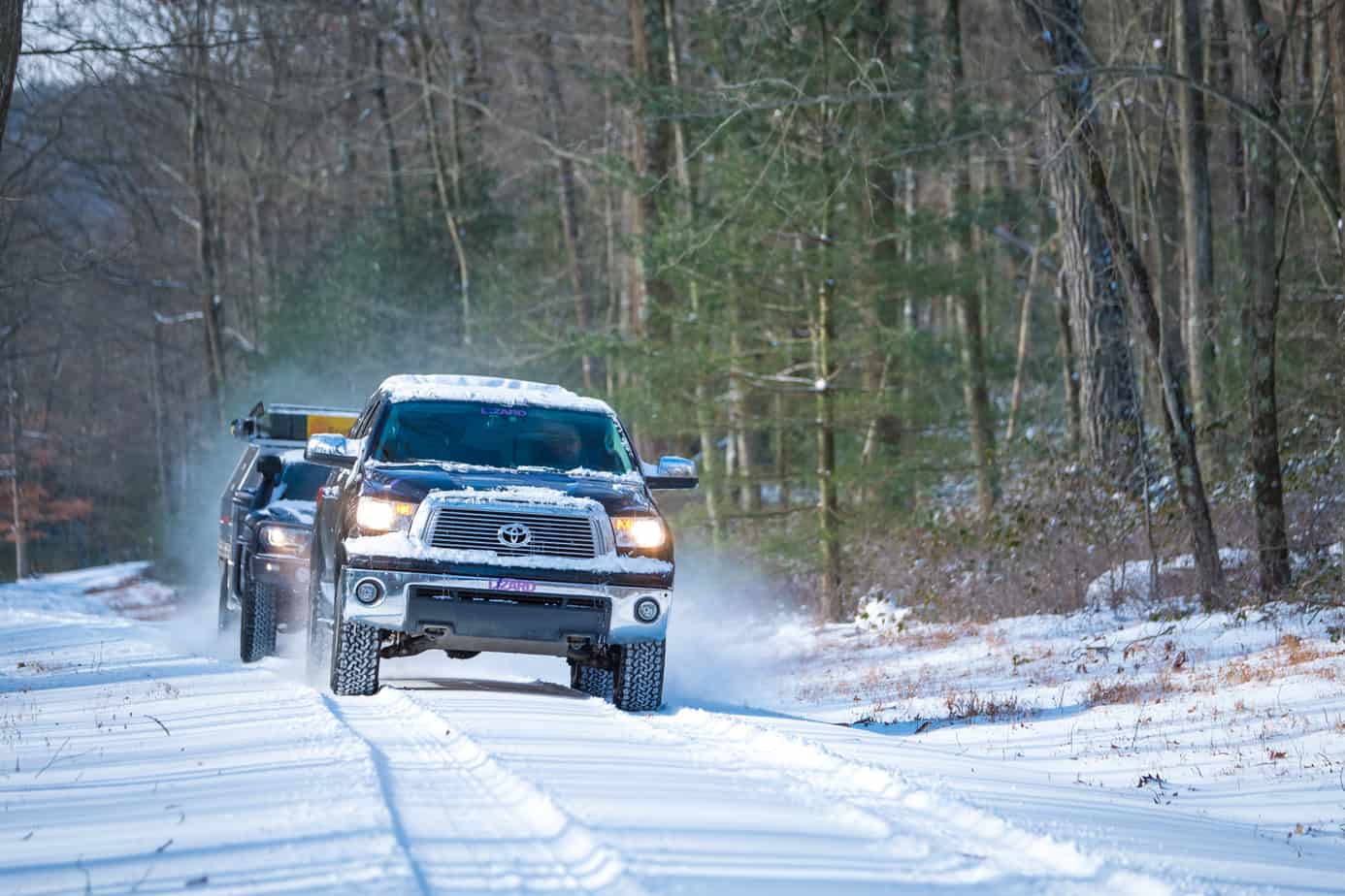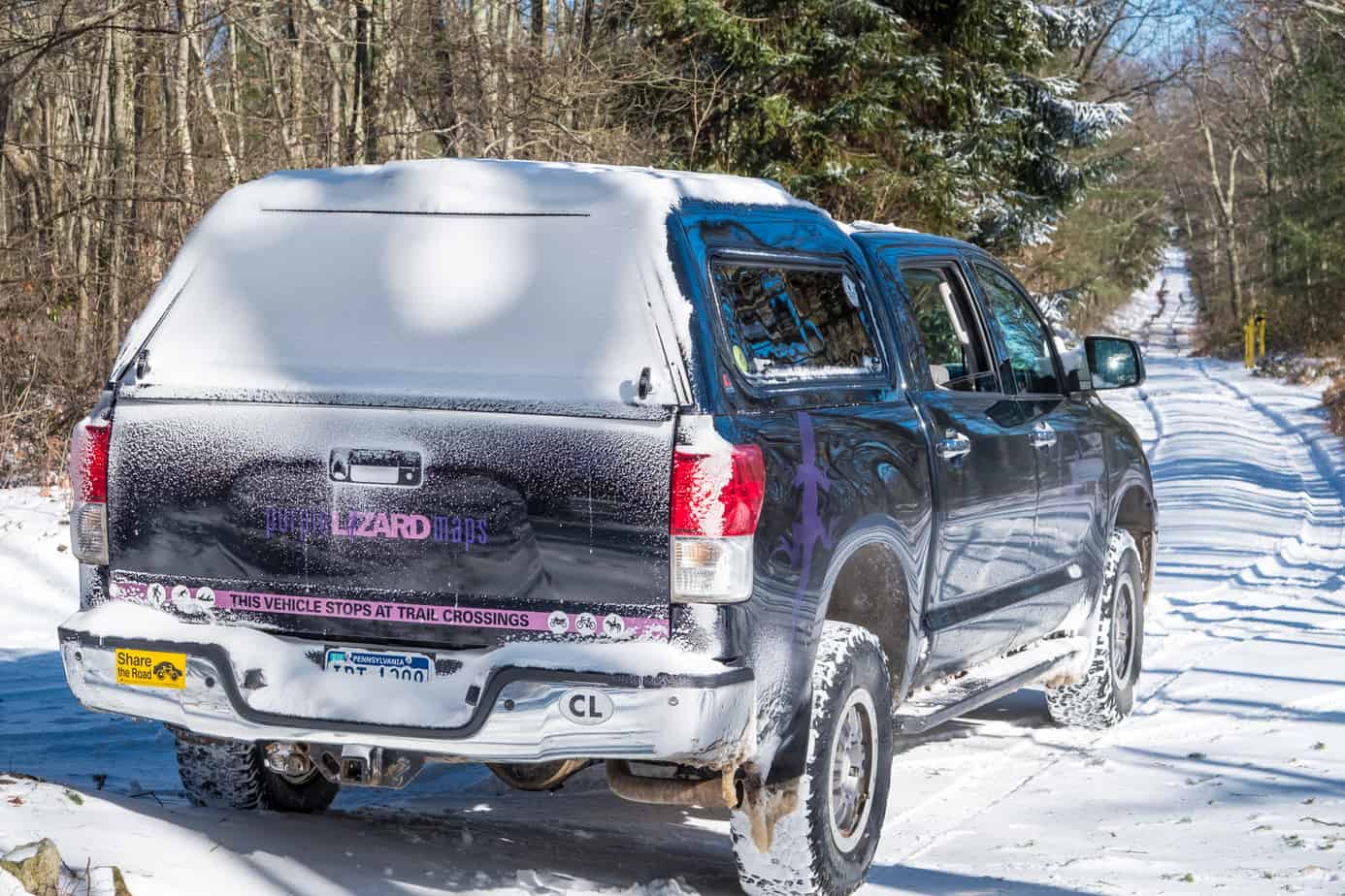 It was hard to believe that less than an hour ago we had been sipping coffee by the warmth of a fireplace and now we were deep in the woods of Pennsylvania taking photos of the Main Line Overland Tacoma. Our plan for the day was to meet up with Michael Hermann of Purple Lizard Maps and follow some of his favorite trails to see what adventures the east coast had to offer. Before long, Michael’s black Toyota Tundra rolled into view, and we set off into the snow, plowing fresh tracks as we went.