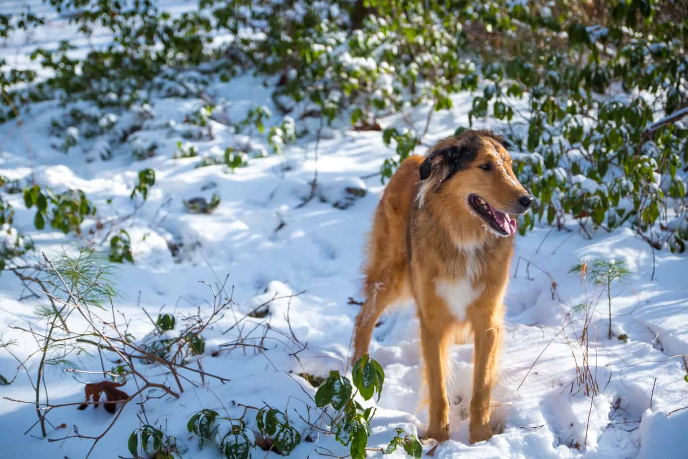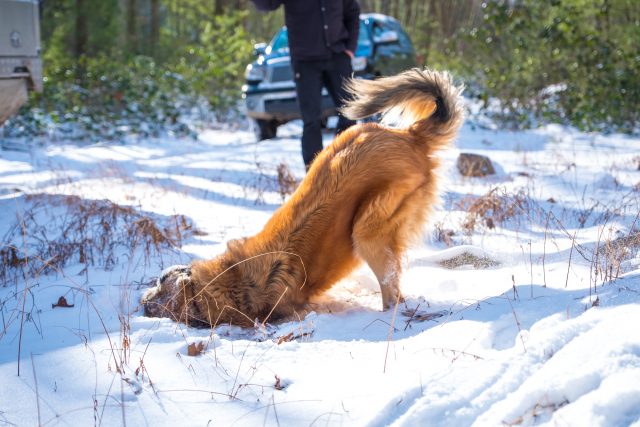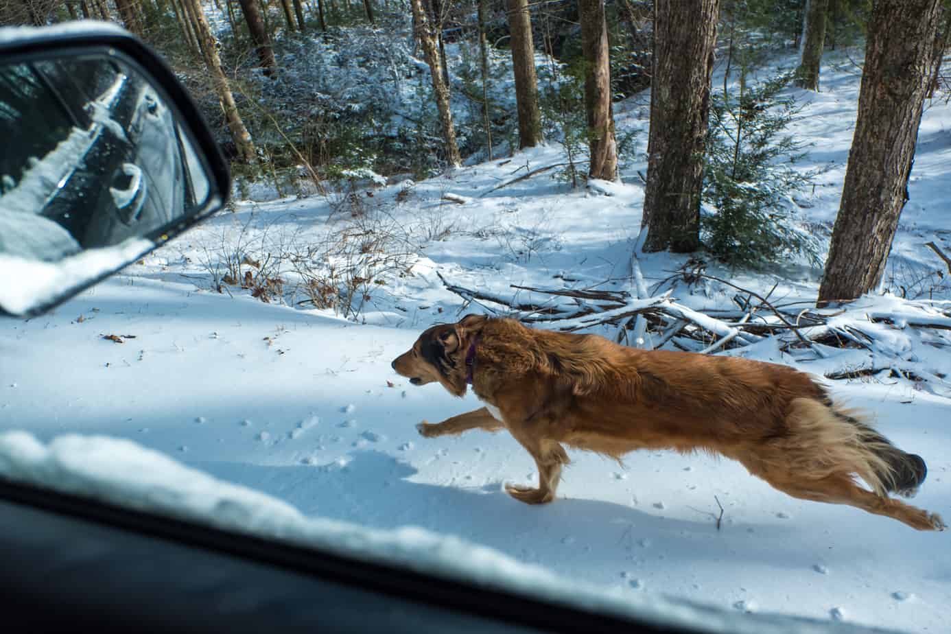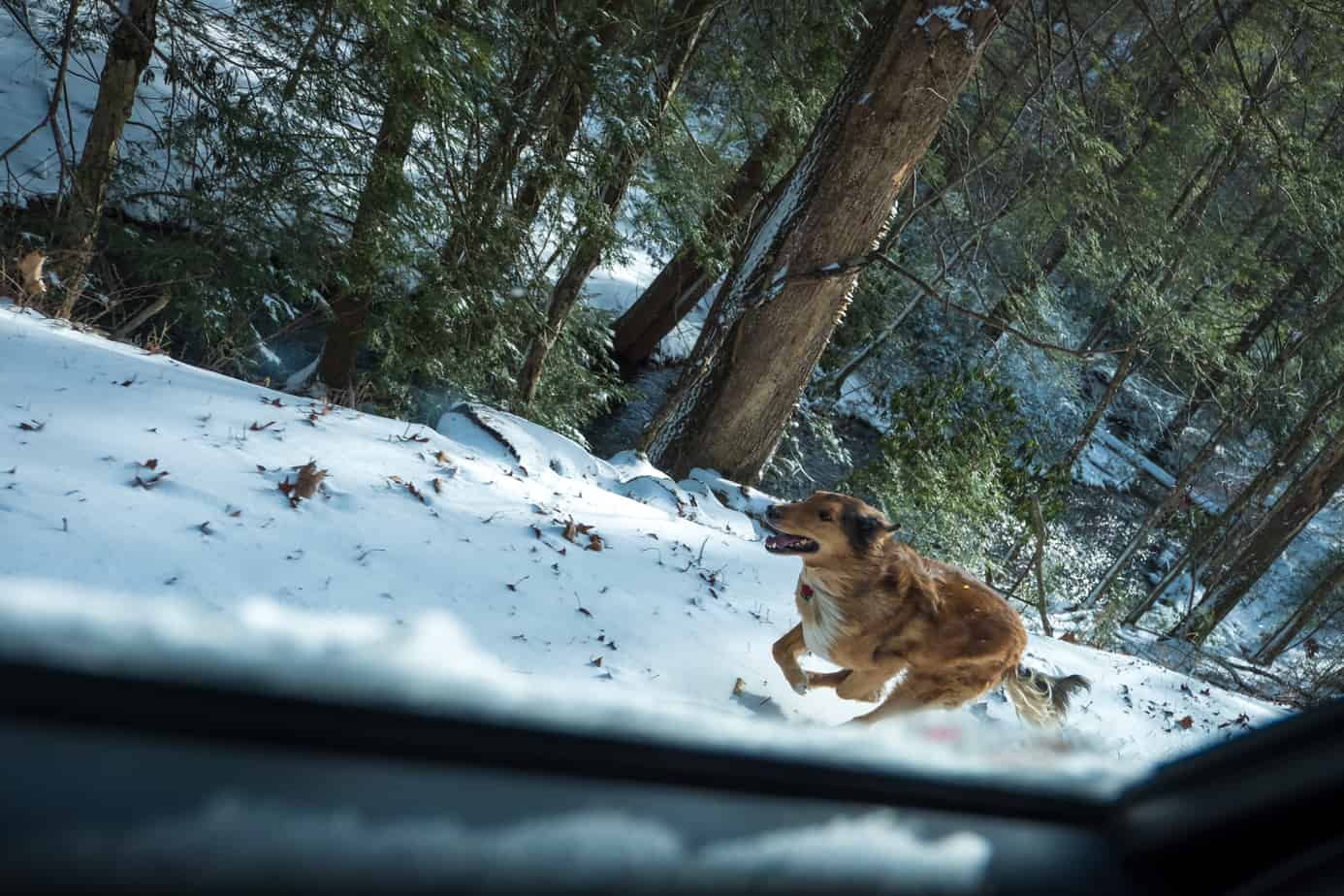 The landscape must have heard it, because it eventually relented, opening up to a babbling, soft sunlight through the trees. The water was a tea-stained brown thanks to all the melting snow and decaying leaves, but it was scenic nonetheless. We made a stop to take photos and stretch, while Michaels dog returned to frolicking in the snow.