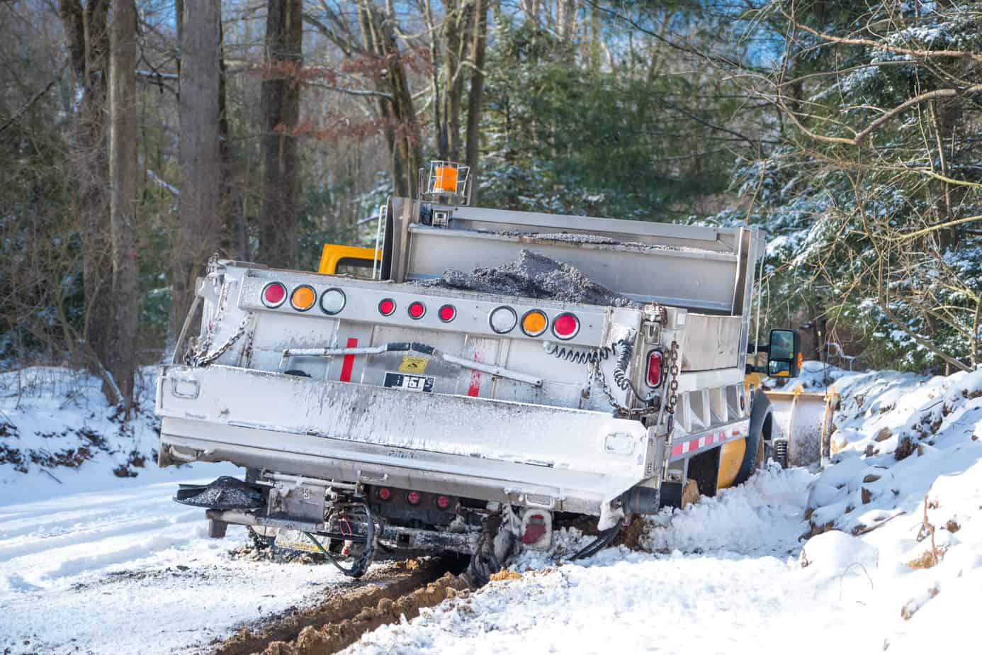Although the road was firm, the melting snow had covered some sections in a slushy mix of icy water, and we found ourselves splashing through it as the trail narrowed to a single vehicle width. Other sections were softer and required more caution to avoid causing ruts. Divergence from the center of the road to the shoulder was the biggest danger as it could suck a vehicle in before you knew what happened. This plow truck found out the hard way.