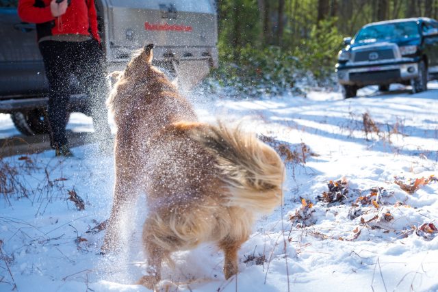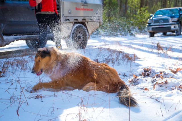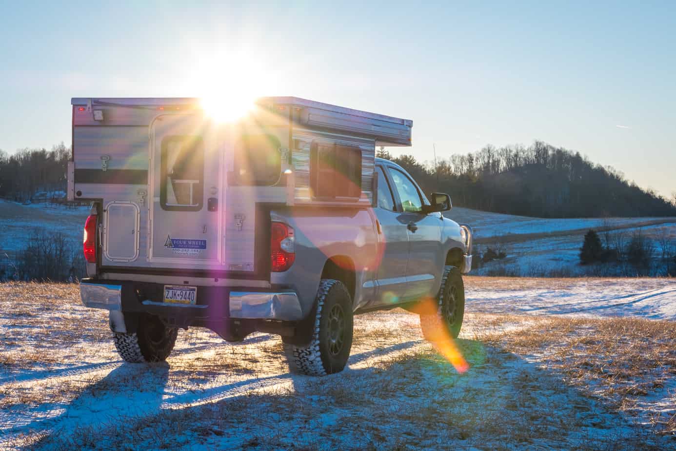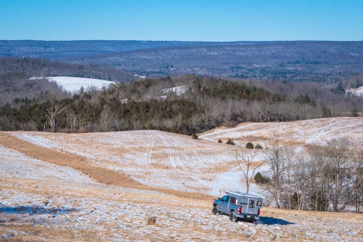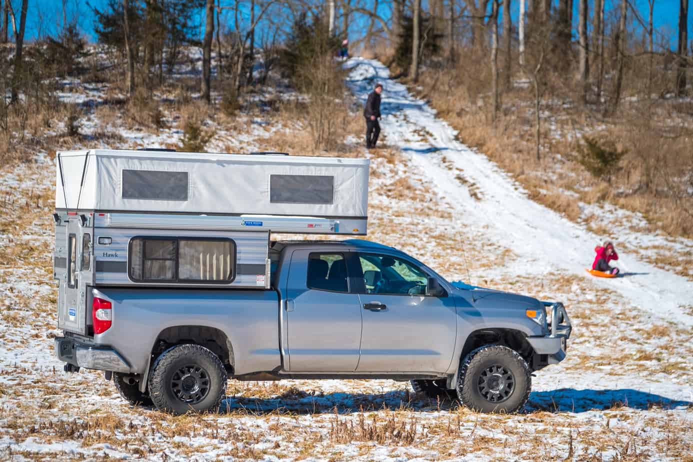 After some exploring on dirt roads and winding around farmland, we found the perfect candidate. It was tall, steep, smooth, and had a long open field at the bottom for slowing down. It also had more snow than the surrounding terrain, so we parked the truck, popped the top on the Four-Wheel camper, and cranked up the heater to a balmy 70 degrees. Before long, the four of us were darn near baking inside and we unloaded to hit the hill.