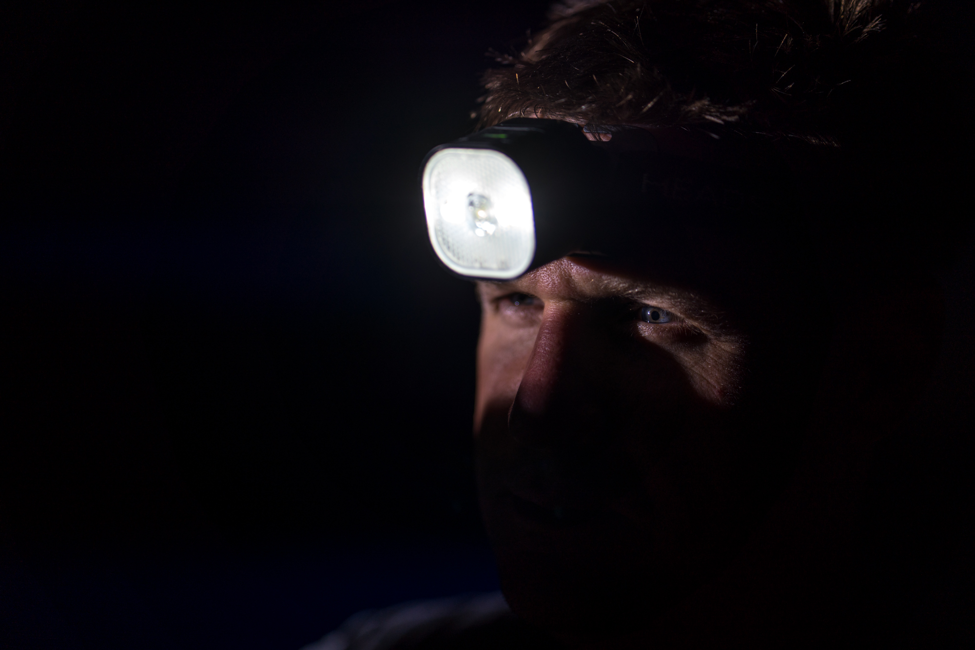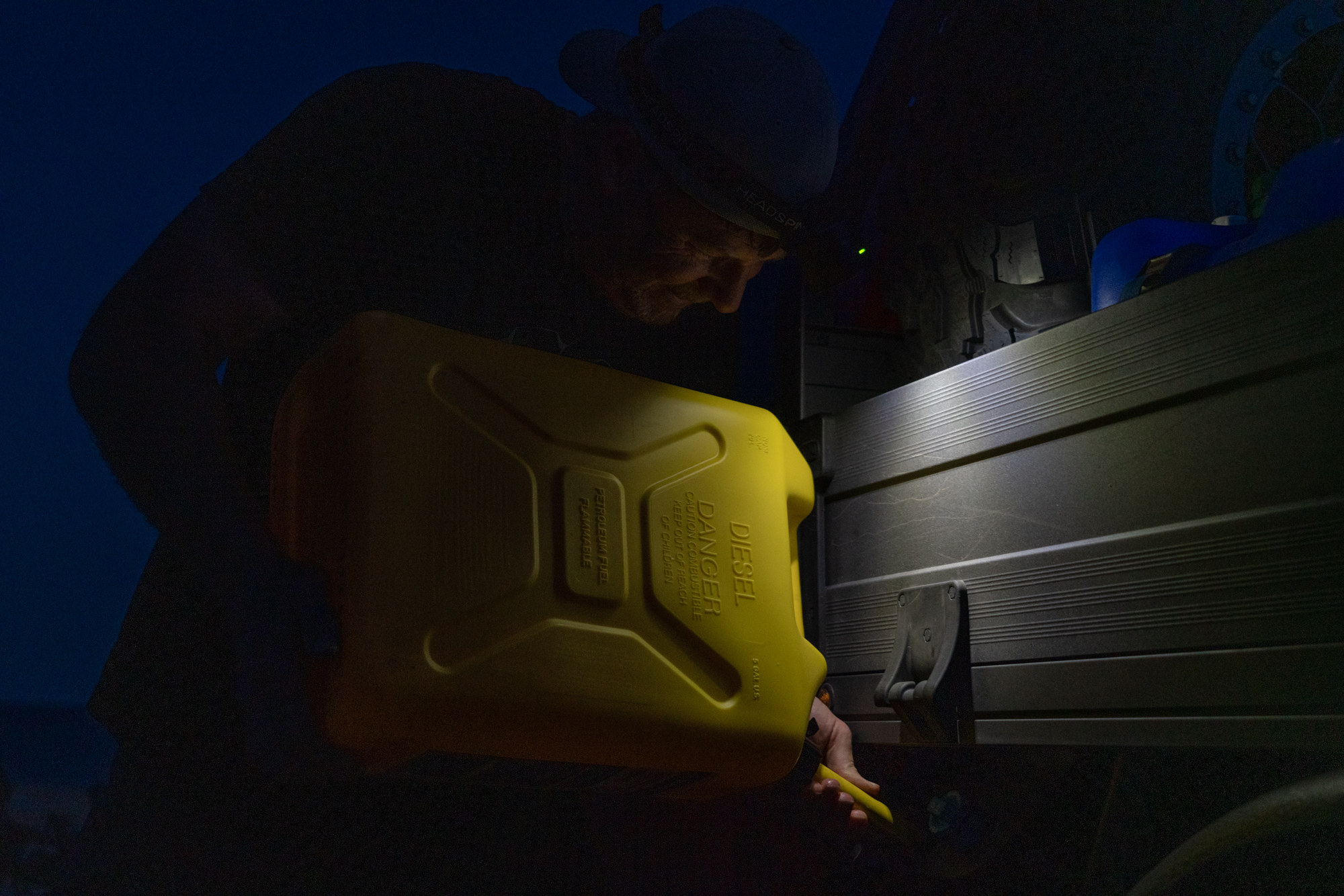 During the last few nights of the trip, we were pushing the schedule and seemed to arrive right as the sun was setting. This meant that vehicle inspections, servicing, and camp setup was occurring in the dark. We even needed to top up the fuel tanks by headlamp, all making for a good excuse to use the Headspin.