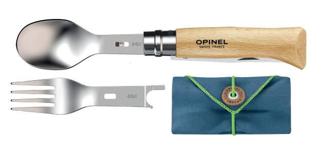 To complement the Nomad Cooking Kit, Opinel has released Picnic+ innovative cutlery inserts which are smart, durable accessories for on-the-go meals and camp cooking, and won the Best Innovation Award from Carryology at Outdoor Retailer 2022. The Picnic+ set utilizes the Virobloc safety ring on the No.08 folding knife to hold the fork or spoon insert in place. Genius! The fork and spoon inserts directly into your No.8 Opinel knife (from 2000 CE onwards), and we suggest that you might consider carrying two affordable No 8s as you will therefore have a complete cutlery set at meal times.