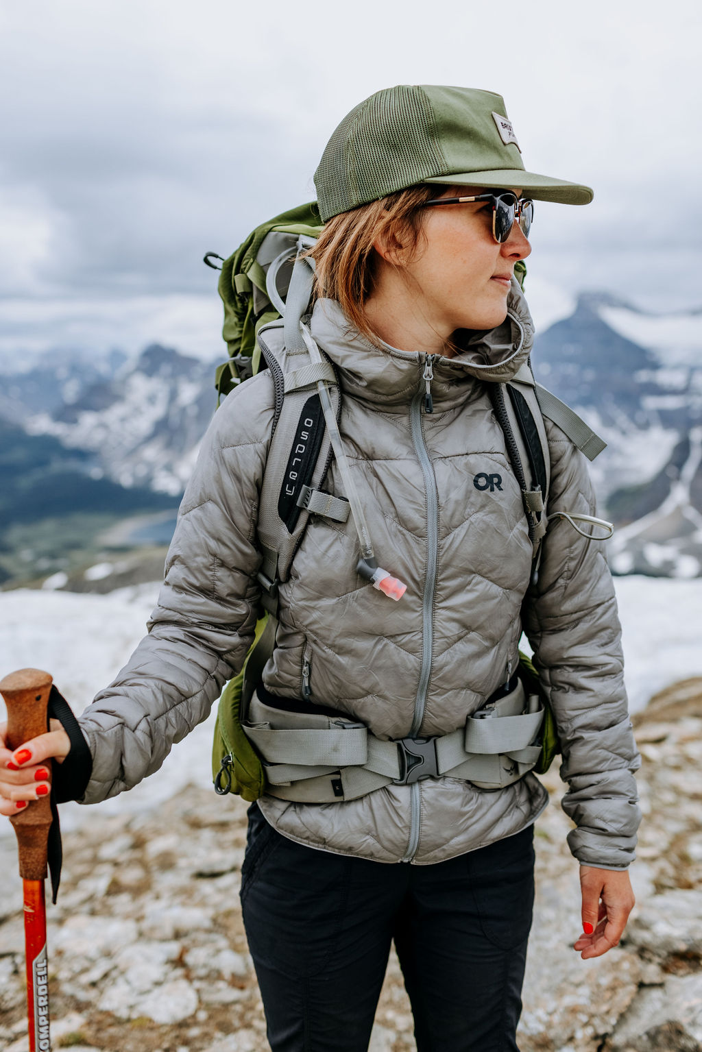 Outdoor Research succeeded in its quest for the ultimate lightweight synthetic jacket with a stellar warmth ratio—however, to truly achieve “four-season warmth” (at least, where I come from), the jacket should be used as a mid-layer and combined with a heavier puffy or shell. The 100 percent nylon 12D ripstop shell and lining feature a water-repellent coating meant for light moisture only—pack additional layers for the Pacific Northwest or other rainy locales. On warmer days, the interior nylon liner didn’t feel great on bare skin (I would go with my Arcteryx Atom LT Hoody if wearing a tank or sleeveless top). But it felt wonderful with anything long-sleeved underneath and kept me comfortable on chilly evenings at camp or while descending the windy Nub Peak in Assiniboine Provincial Park.