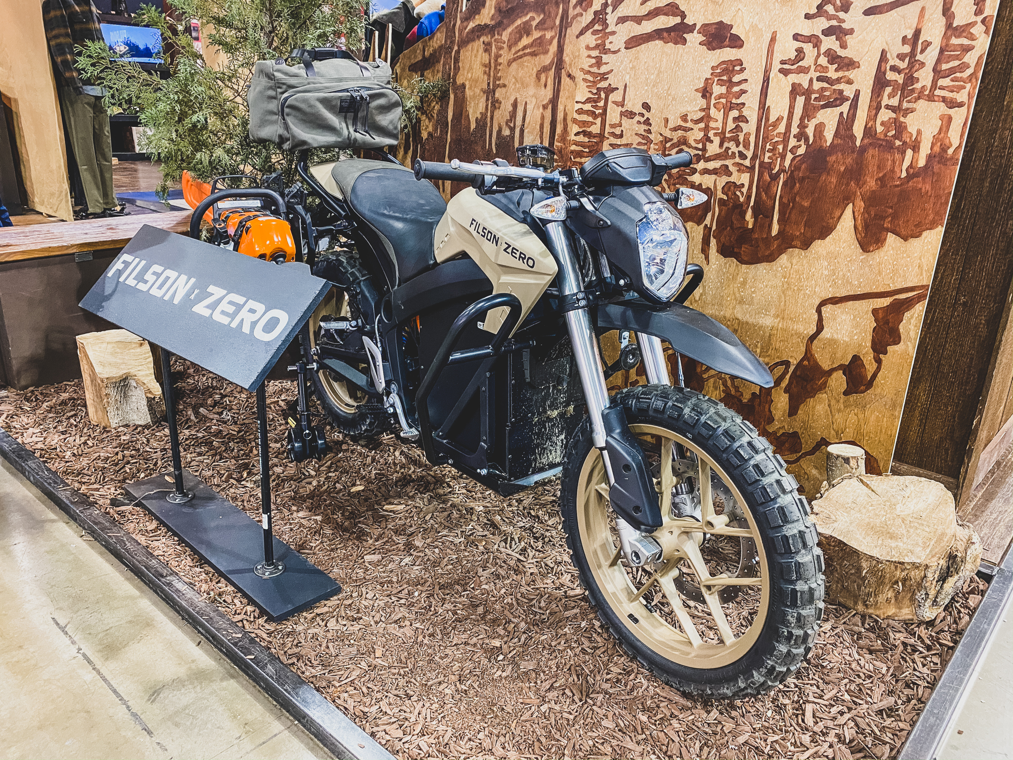 Zero Electric Motorcycles had their dual-sport model on display in the Filson booth. Filson is launching their new line of motorcycle jackets, pants, and accessories.