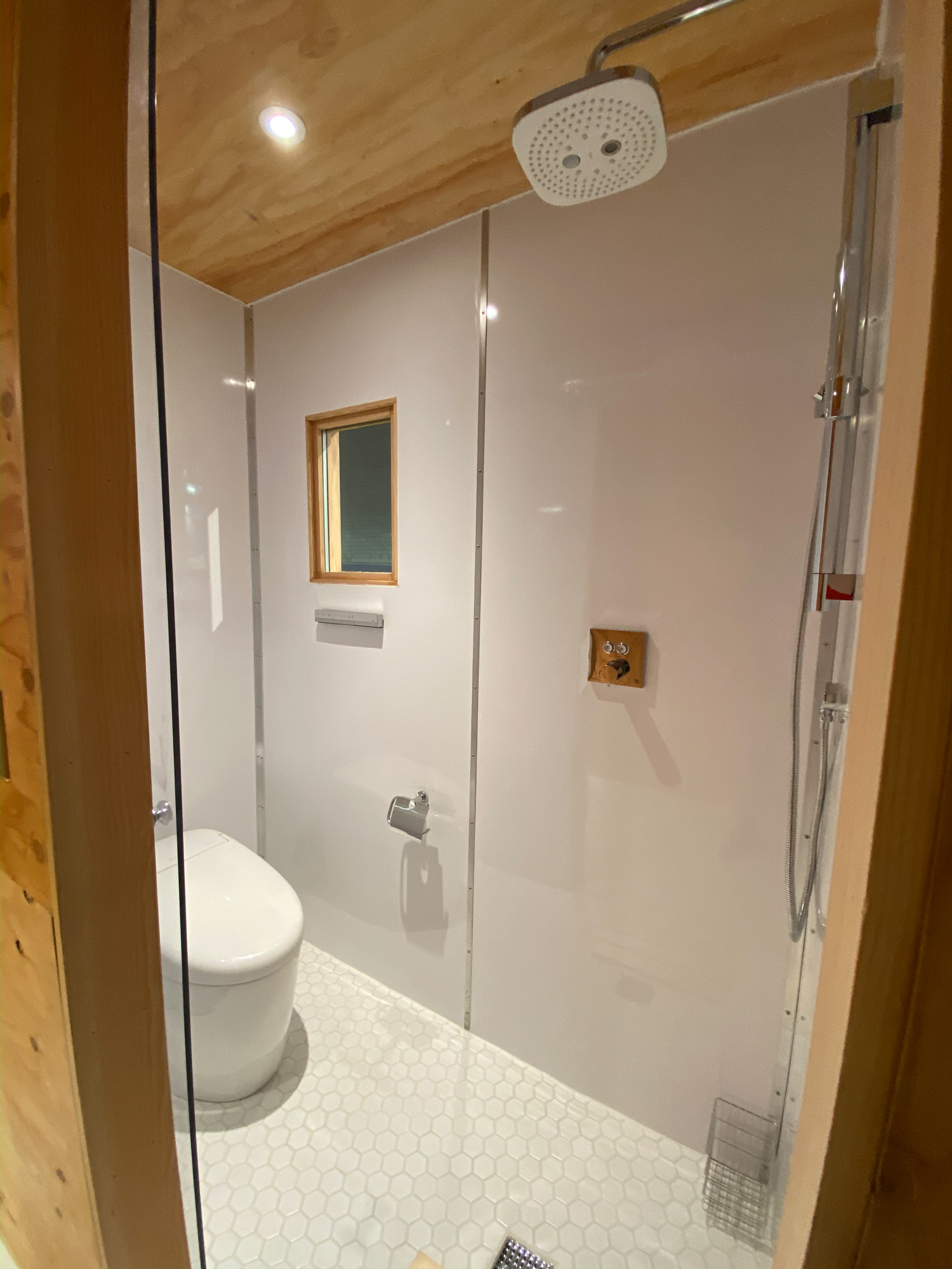 The exterior is made from wood and a steel roof, thick walls showcasing the additional insulation.