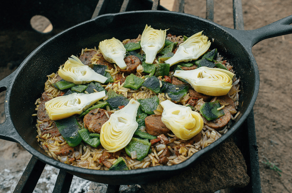 Paella began as a mid-day meal that was prepared for laborers working in the fields. Cooked in a broad, shallow pan over an open flame, this versatile rice dish would incorporate whatever meat and vegetables were available at the time. As its popularity spread, each region of Spain developed its own unique version of it, resulting in countless provincial variations. This flexibility is great for camping as it allows you to improvise with whatever provisions you happen to have on hand.