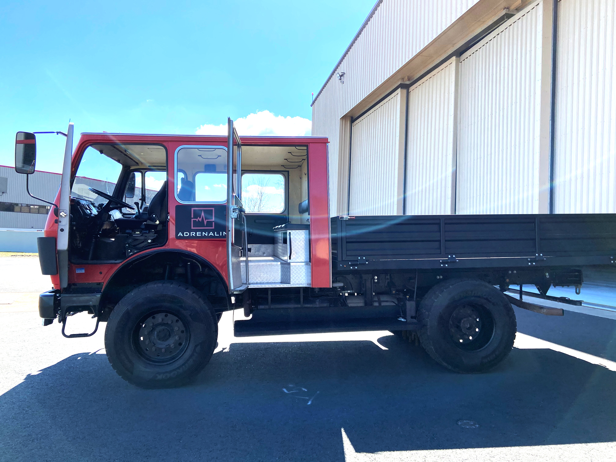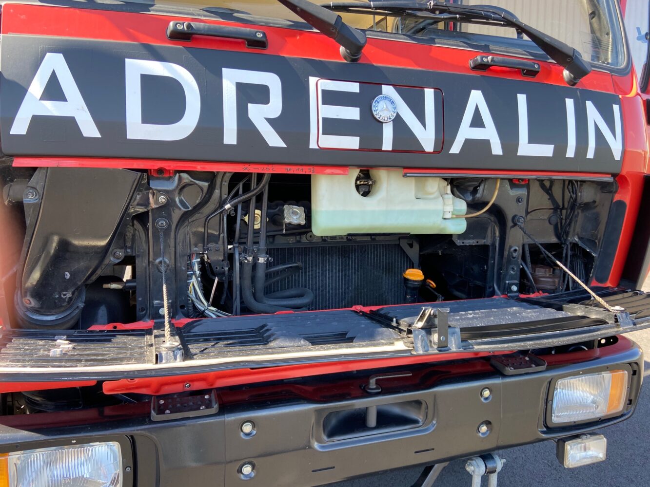“This 1222 AF used to be a technical support truck for the voluntary fire department in Bad Orb in Germany, a small town east of Frankfurt. A lot of work went into this vehicle to make it the multi-role giant pickup truck it is today. The massive rolling-doors steel box has been removed. Custom-built steel frame/aluminum flatbed (all treated with bed liner and heavy-duty L-tracks all around the sidewalls and floors) with folding and removable sides has been installed large enough to carry four to five dirt-bikes, three snowmobiles, my wife’s Mini Cooper, our pop-up camper, or numerous types of shelters or expedition boxes.”