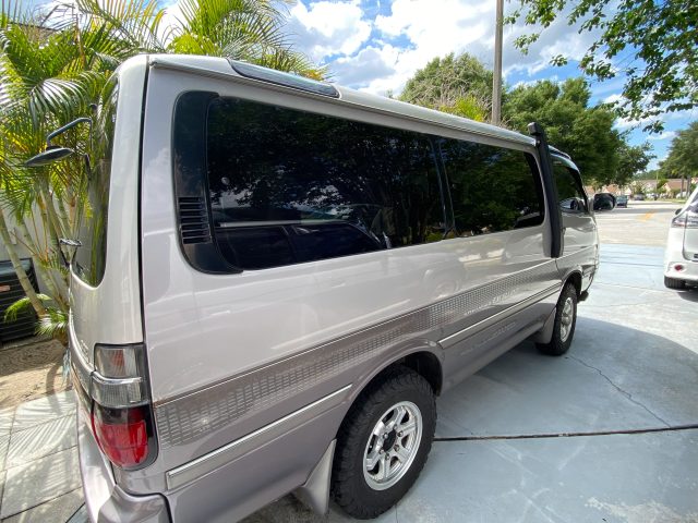 The Hiace 4WD is fitted with a 3.0 motor that produces 130 horsepower and 287 pound-feet of torque (a higher output version was also offered with 145 horsepower and 343 pound-feet of torque). The interior is not luxurious by modern standards, but it does provide power windows, locks, and mirrors, front and rear air conditioning, electric curtains, front, middle, and rear sunroofs, and third-row seats that convert into a bed.