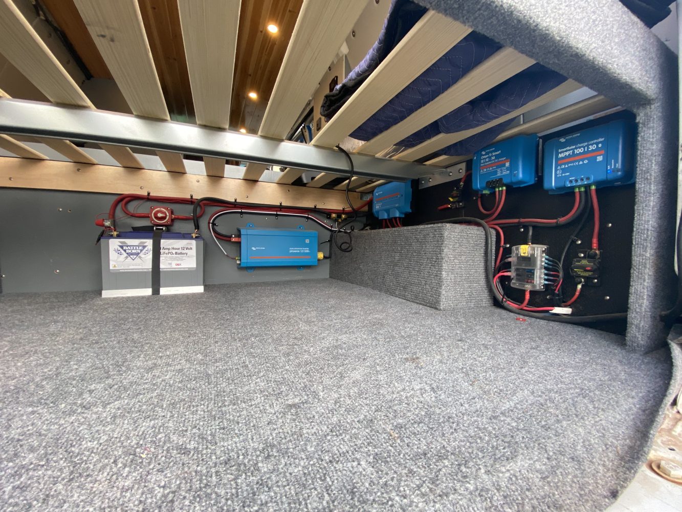 - Full Victron Energy electrical system including a 30A Mppt Solar controller, 30A Dc/Dc charger, Lynx Distributor, Pheonix 1200w Inverter (two 120v outlet locations), BM-712 Battery monitor
