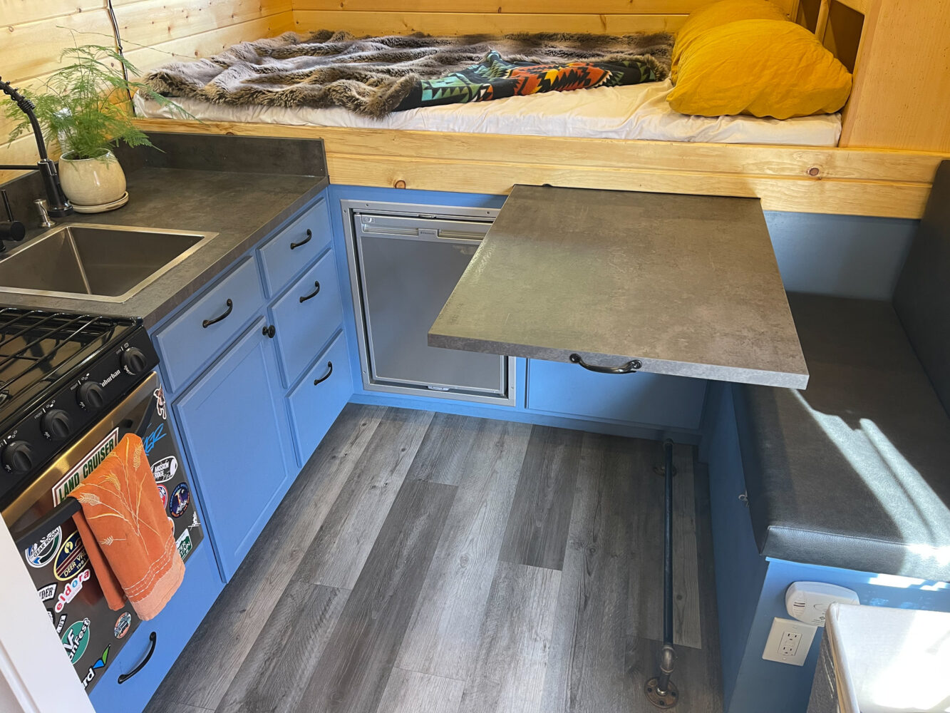 Table that slides out from under the bed (24- x 36-inch) to create a dinette table and additional matching counter space