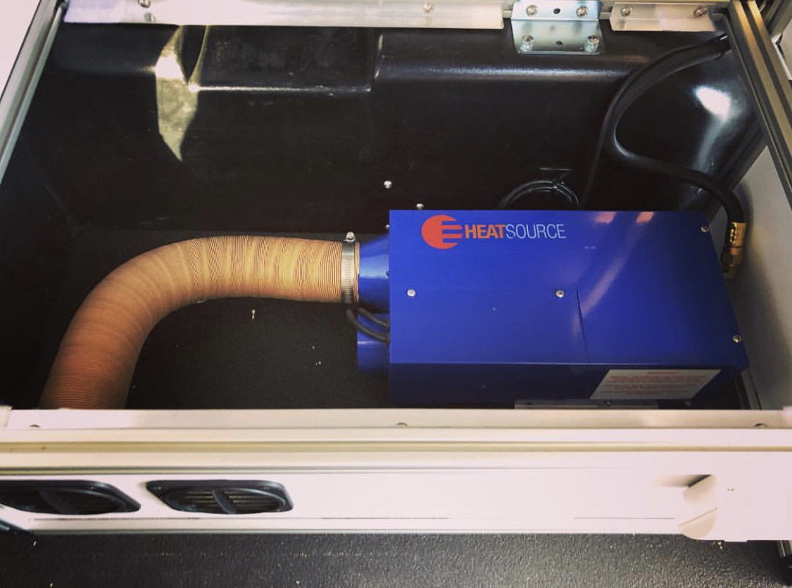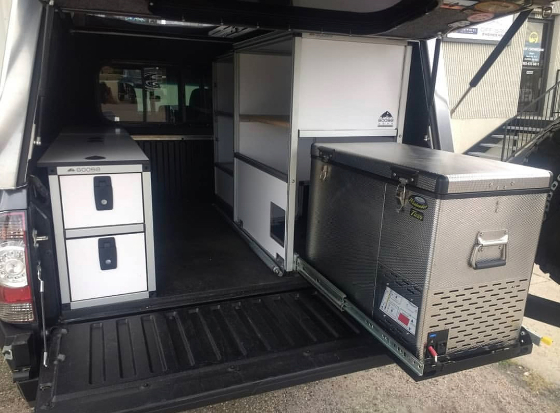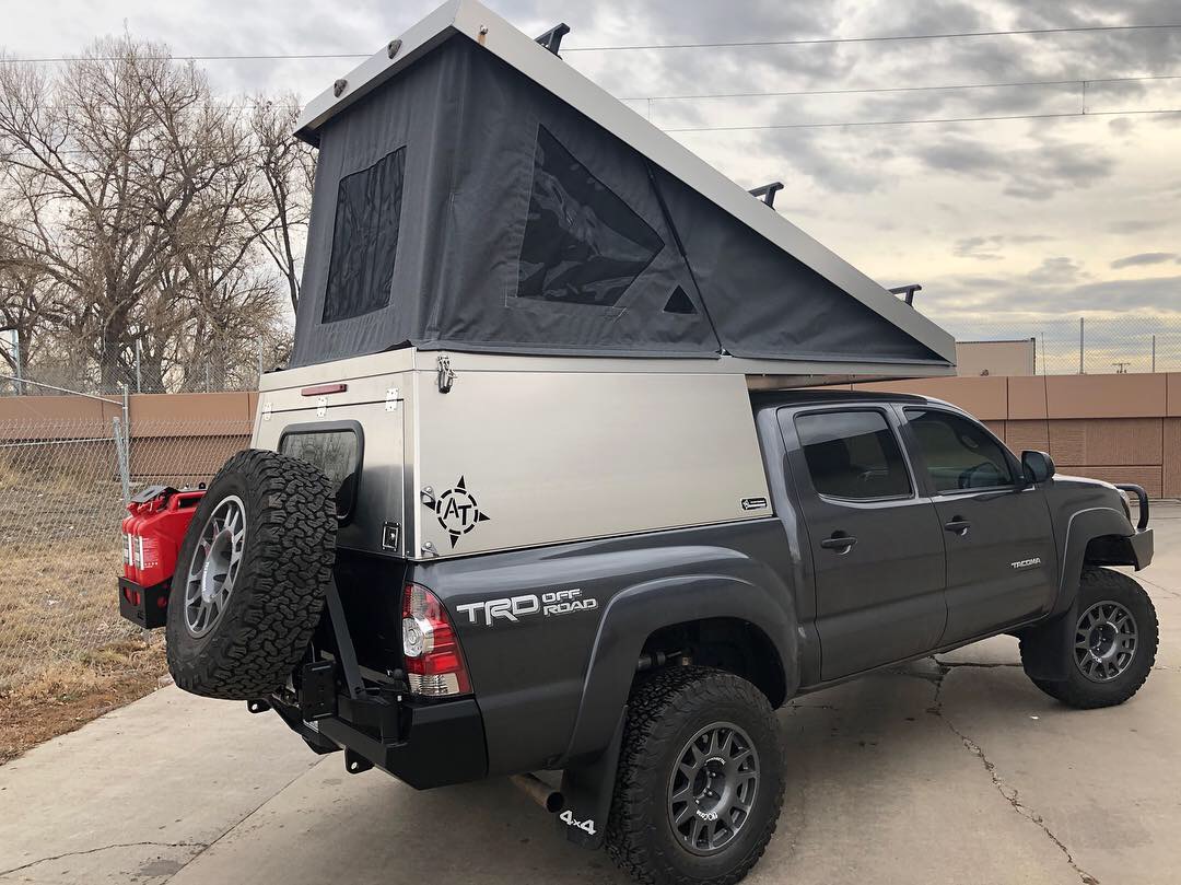 This Tacoma is also outfitted with an AT Overland Summit canopy camper system that is approximately 1.5 years old (and has only been used for trade shows). This camper has upgrades, including a window in the rear liftgate, a passenger-side flip-up hatch, opening windows between the truck cab and Summit camper, USB charging outlets, LED lighting, aircraft track on the roof, and load bars. Inside the AT Summit are complete interior Goose Gear cabinets with a Tembo Tusk locking refrigerator slide and a National Luna Weekender 50-liter fridge/freezer. A Propex heater (controlled with a thermostat) has been installed neatly in the Goose Gear cabinets to keep the camper warm on chilly nights. There is also a carbon monoxide detector installed for safety.