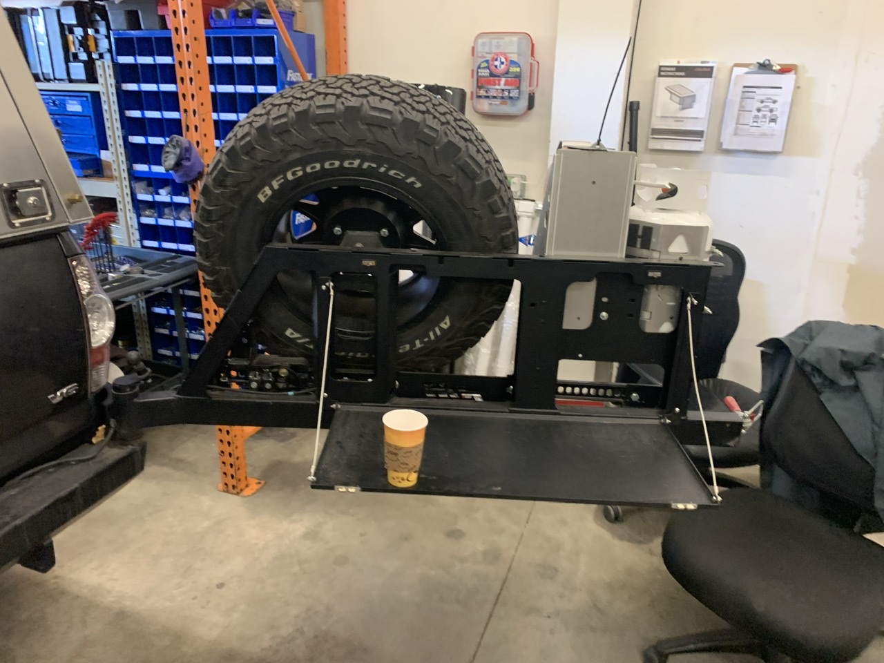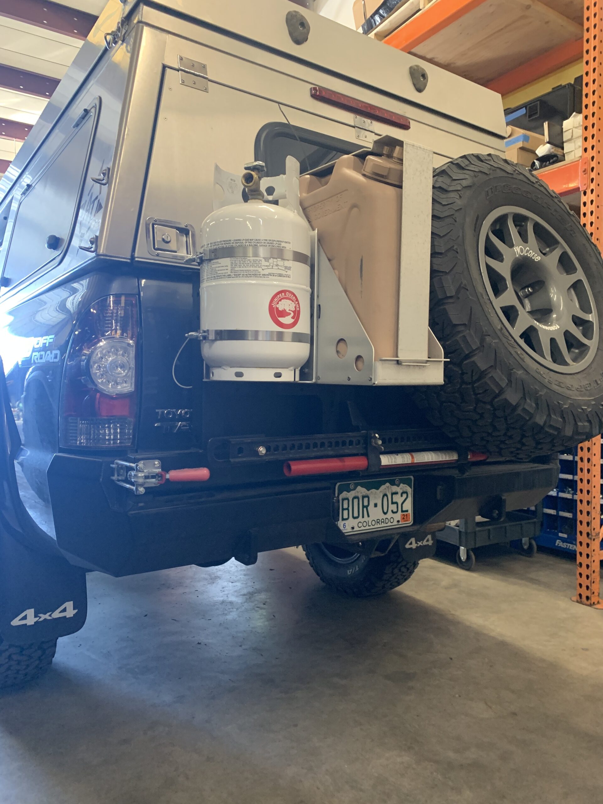 - CBI rear bumper with full-length swing-out holding a full-size spare, AT can holder, AT propane tank holder, 10-pound propane tank, Hi-Lift jack, and flip-down table when bumper is open for cooking at camp. Can be reconfigured to a new owner’s needs. All current mounts, brackets, tanks, and a Hi-Lift jack are included.