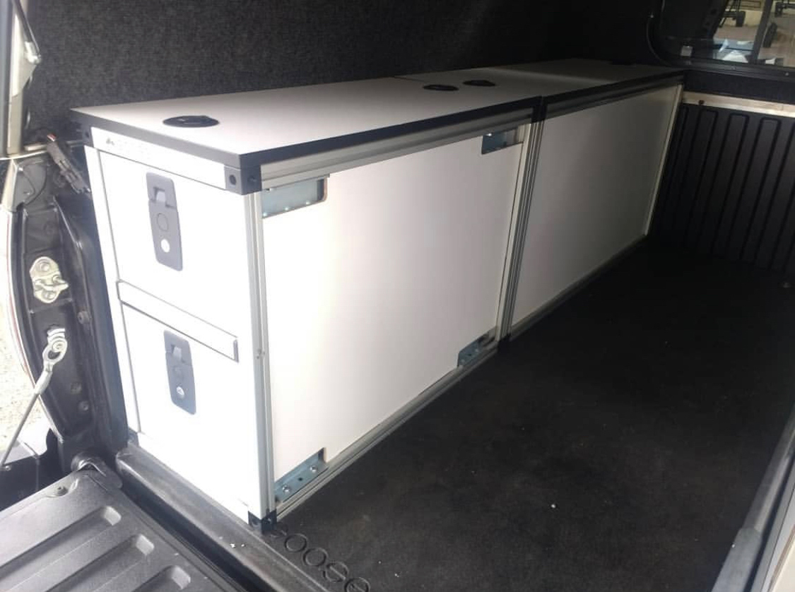 This Tacoma is also outfitted with an AT Overland Summit canopy camper system that is approximately 1.5 years old (and has only been used for trade shows). This camper has upgrades, including a window in the rear liftgate, a passenger-side flip-up hatch, opening windows between the truck cab and Summit camper, USB charging outlets, LED lighting, aircraft track on the roof, and load bars. Inside the AT Summit are complete interior Goose Gear cabinets with a Tembo Tusk locking refrigerator slide and a National Luna Weekender 50-liter fridge/freezer. A Propex heater (controlled with a thermostat) has been installed neatly in the Goose Gear cabinets to keep the camper warm on chilly nights. There is also a carbon monoxide detector installed for safety.