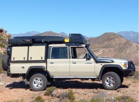 The vehicle has an ARB bumper with a 130 winch and built-in air compressor, two spare tires mounted on a rear double wheel carrier, the suspension has been upgraded with a lift kit and smash and grab window tinting ensures your safety when traveling through dangerous areas. The Cruiser also has an Alucab 5 door canopy with hard-shell roof tent, along with an Alucab 270 degree awning and shower cubicle. Storage is ample with a lockable storage box on the front mounted roofrack. For recovery, a high lift jack and Maxtraxx are available.