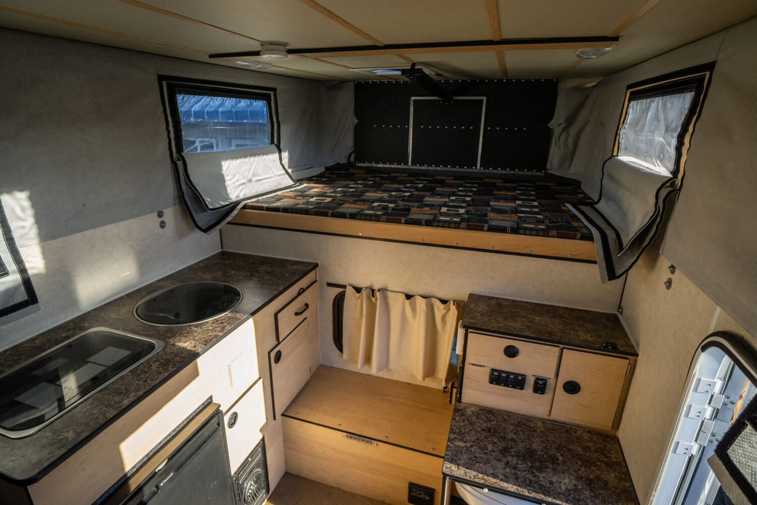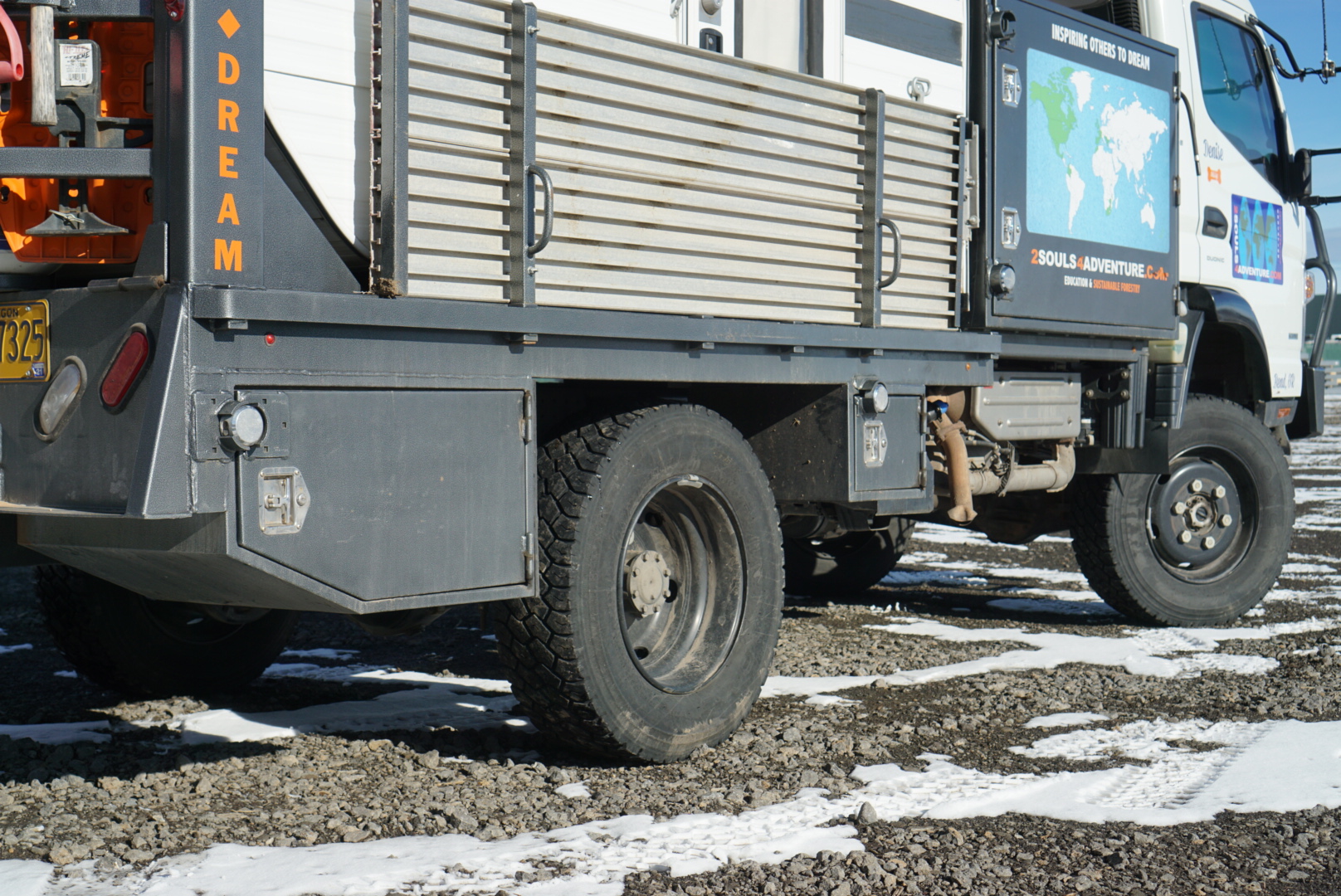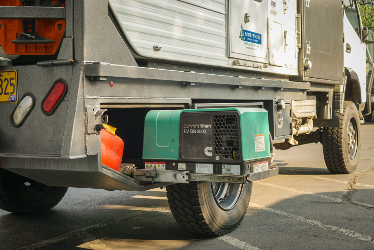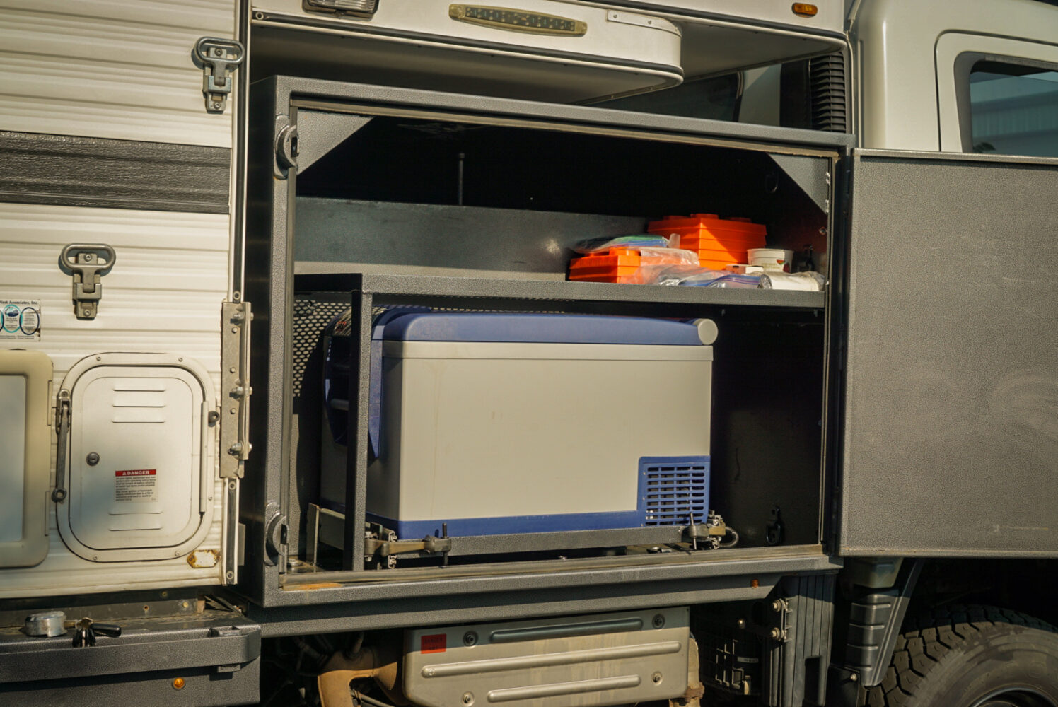 Randy invested a huge amount of time and money into this unique vehicle build, and his designs were all executed thoughtfully for long-term travel. This began with the selection of the relatively lightweight Grandy Camper, leaving the Fuso with a large amount of additional payload capacity. Numerous exterior lockable storage boxes were then integrated to house additional equipment. Two of those compartments provide dedicated storage for a 12-volt ARB refrigerator and a 3.8 kilowatt Cummins Onan diesel generator.