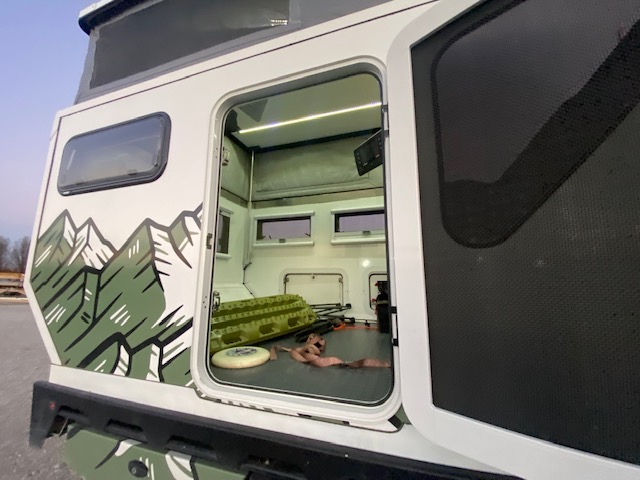 - Composite pop-up camper (interior includes 12-volt linear actuators to raise roof, full power-management system, 130-liter Indel fridge, Tern Overland window package, and much more).