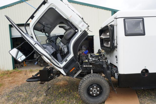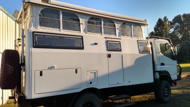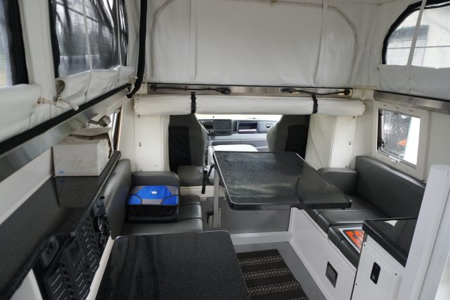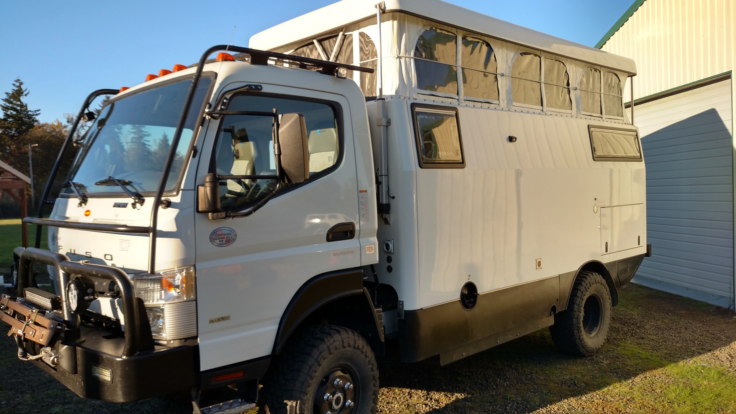 This particular example, built on a 2017 Mitsubishi FG 4×4 diesel, has an automatic 6-speed transmission, simple straight axles with freewheel front hubs, limited slip in the rear axle, Torsen differential up front, 700+ mile range, and so much more. Inside driver comforts include: