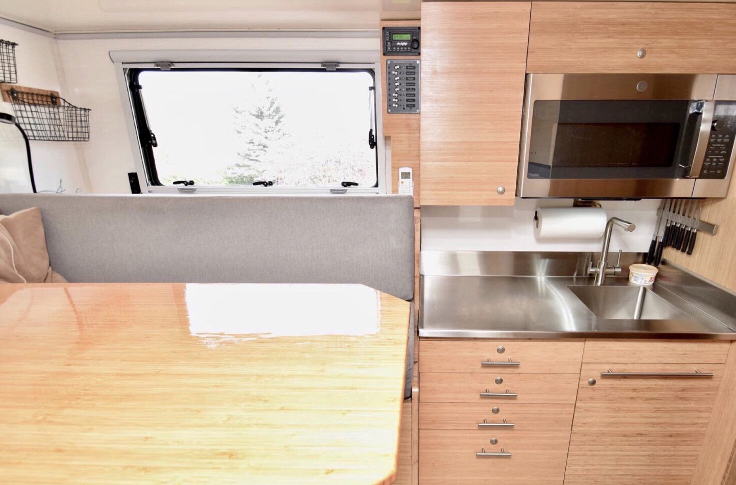 - Private bathroom with mirror, GFCI 120VAC, filtered water bamboo sink, Nature’s Head composting toilet, and power ventilation