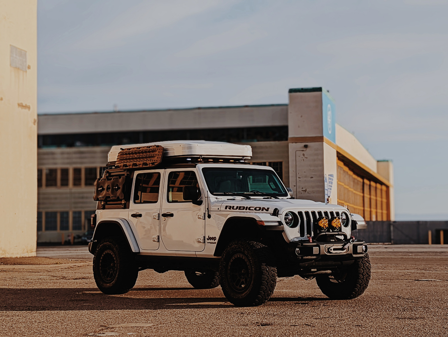 This Wrangler has 22,000 miles and is configured with Apple CarPlay and an 8.4-inch Uconnect Alpine audio package with subwoofer speakers. Sleeping quarters include a Trustmade rooftop tent mounted to a Maximus-3 JL Rhino-Rack Pioneer platform, while storage and organization are optimized by the Morryde drawer system and Front Runner boxes.
