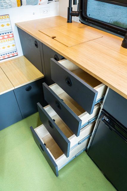 The Sprinter 4×4 is fitted with a 3.0-liter V6 motor that produces 188 horsepower and 325 pound-feet of torque (today’s example has been chipped for an additional 30 horsepower). A dependable engine and drivetrain are matched with impressive all-terrain capability thanks to Mercedes’ intelligent 4WD (technically AWD), which can send up to 33 percent of the torque to the front wheels. In addition, this model has 20 percent more ground clearance than the 2WD and a lower geared differential to tackle technical terrain. There’s a wide range of aftermarket parts from the likes of ARB and Van Compass.