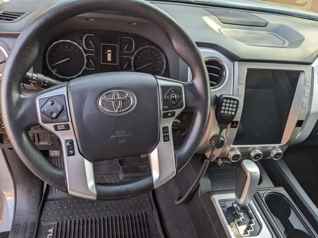 The Tundra is fitted with a 5.7-liter V8 that produces 381 horsepower, 401 pound-feet of torque, and returns a combined 14 mpg. A powerful motor is matched with impressive all-terrain capability thanks to Toyota’s 4WD A-TRAC (Active Traction Control), 2-speed transfer case, an automatic limited-slip differential (which uses rear brakes to simulate a mechanical limited-slip differential), 10.6 inches of ground clearance, and more. The interior is well-equipped, with driver comforts that include: