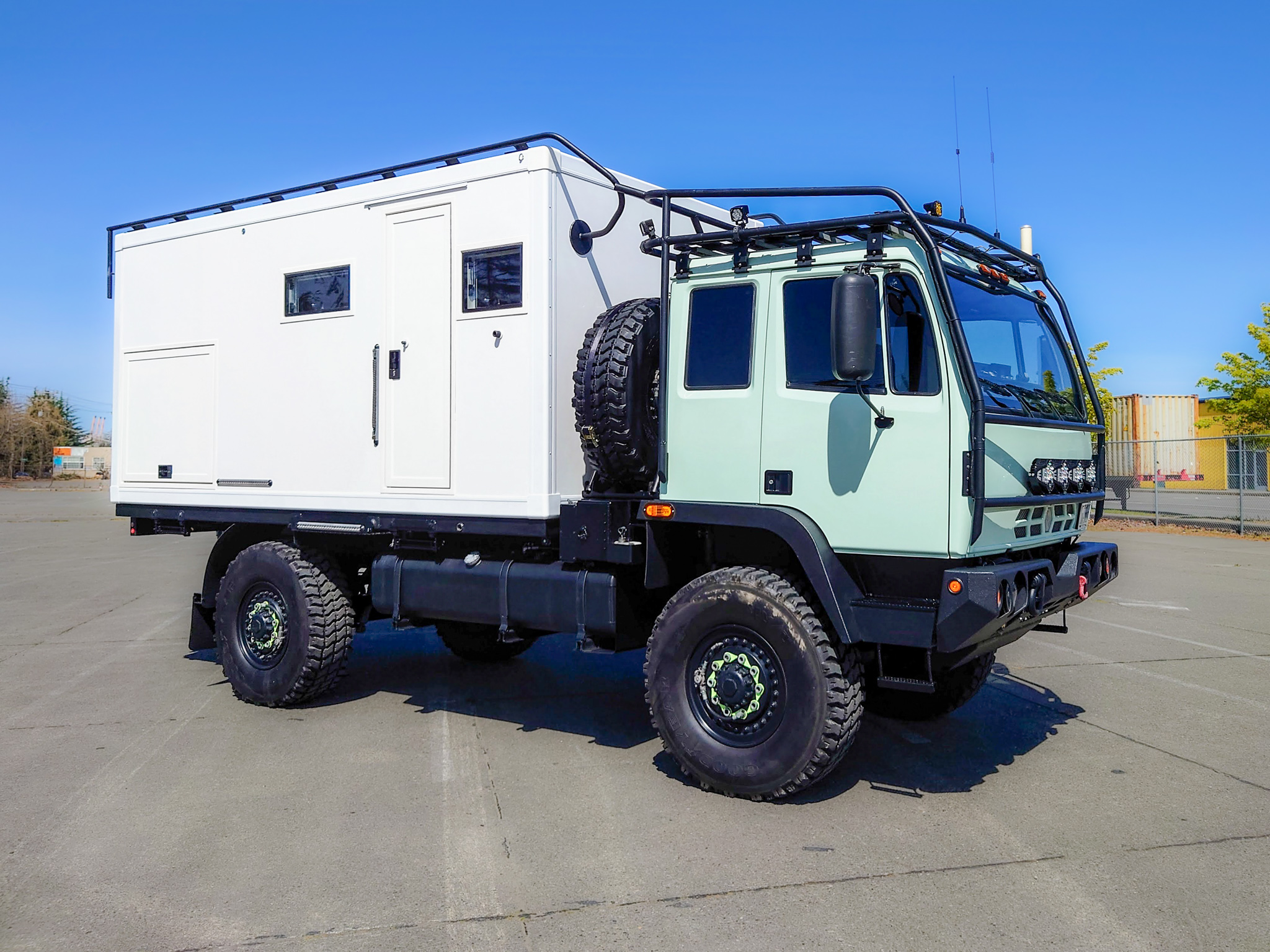 This Family of Medium Tactical Vehicles (FMTV) line of trucks was initially designed exclusively for military use; however, the Acela Truck Company has since made them available to the public, with the “Monterra” being their flagship vehicle. The company does not simply resell these vehicles; rather, each truck receives a comprehensive rebuild, including over 300 point tests and inspections and more than 600 certified OEM-guaranteed parts. The Monterra 4×4 (LMTV M1078a1) is fitted with a Caterpillar C7 diesel engine that produces 330 horsepower and a monstrous 860 feet-pound of torque. A powerful engine is matched by excellent all-terrain capability, with 4WD features that include: