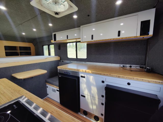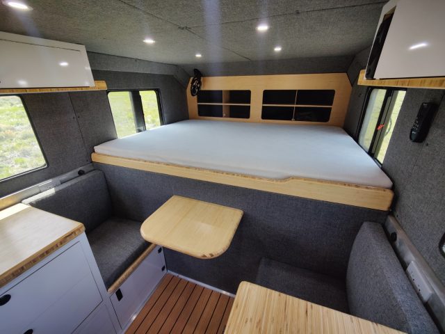 “Our latest build is a truly awesome machine. It’s an international, overland-ready expedition vehicle built with the highest regarded industry components. The truck manages rough terrain smoothly and provides a luxury driving experience on the road. The entire camper runs off a single fuel source. Whenever you fuel up at a diesel station, you’re able to ensure your cooking and heating sources are topped off as well. The camper features a drop-out shower stall and slide-out toilet, providing the benefit of a fully-enclosed bathroom but utilizing far less space in the camper. The lithium-powered solar system keeps everything powered. The 6.7 Powerstroke engine moves the truck along swiftly with more than ample torque for even the steepest of mountain grades. Rough and rocky terrain? Deep desert sand dunes? Deep water crossings? Don’t worry. With 42-inch Continental tires on Beadlock wheels you can simply air down, engage your front locker, and continue to push through the most challenging terrain en route to your next dream overland destination. Once you’re back at camp, easily air up utilizing the onboard air system plumbed to each corner of the truck. Once home after a long adventure, you are free to simply lift the camper off the truck using the Rico lift jacks, leaving you with an off-road ready, flatbed work truck/tow machine.”