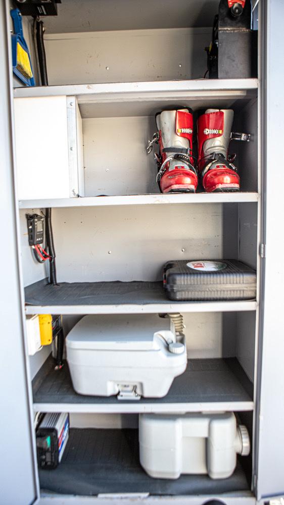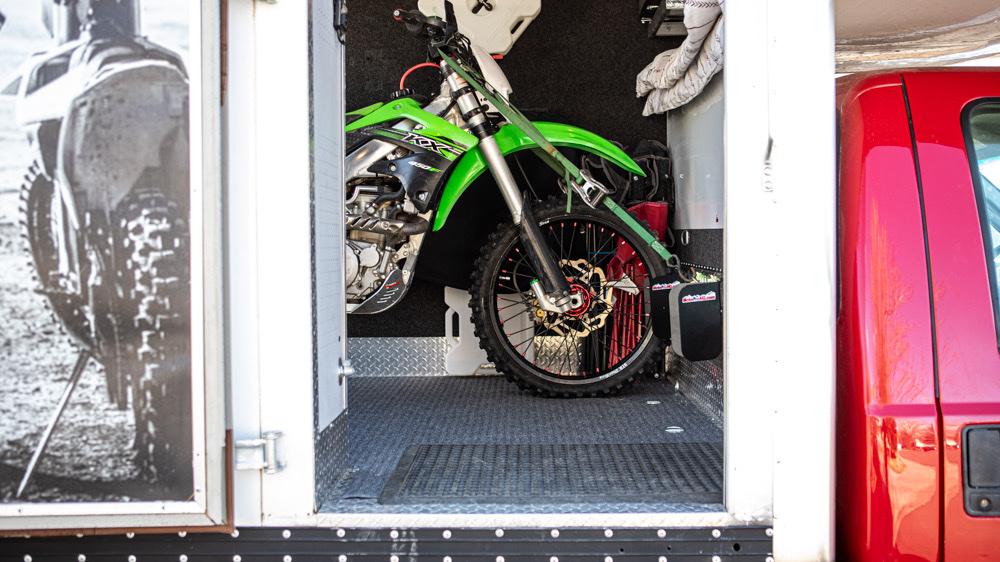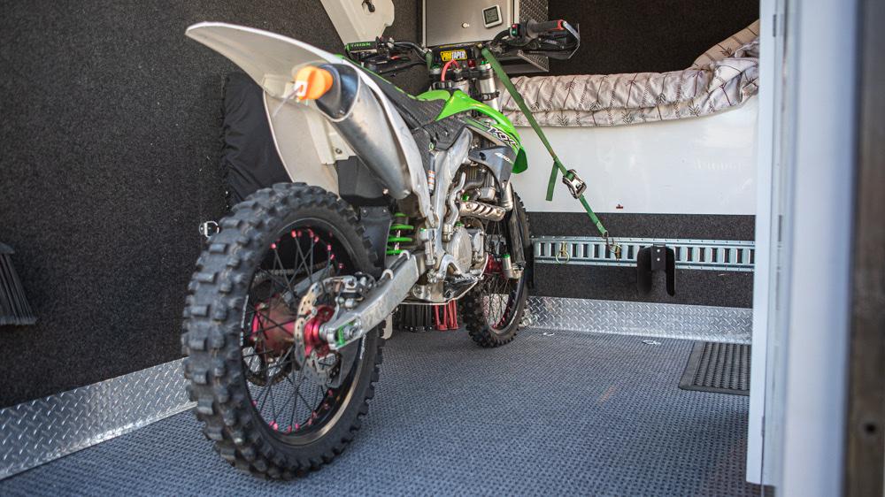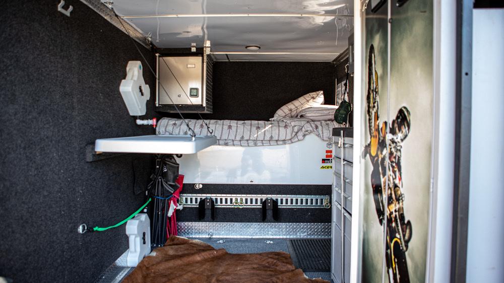 Ginger isn’t all moto-focused, though. It still has your standard camper items like a sliding fridge, 12-volt lighting, a diesel heater, microwave, portable toilet, stove, and a cozy twin bed for cat naps and long hauls. A folding sink allows for more floor or counter space when you need it. Using Rotopax mounts and water jerry cans, you can keep your water handy with a simple gravity-fed system while avoiding winterizing with simple removal. Best of all, there’s storage—lots of storage. From the tool drawers and cabinets inside to the four exterior locking boxes, you will have space for everything you need or want to bring with you.