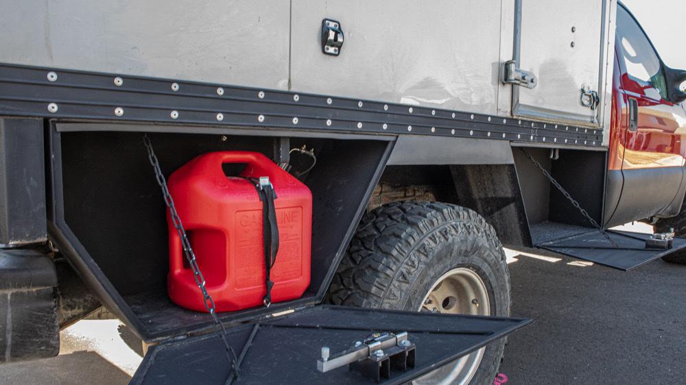 Gravity-fed two-gallon fresh and grey water tanks can be removed instead of winterized; expandable Rotopax mounts allow for more water if you need it
