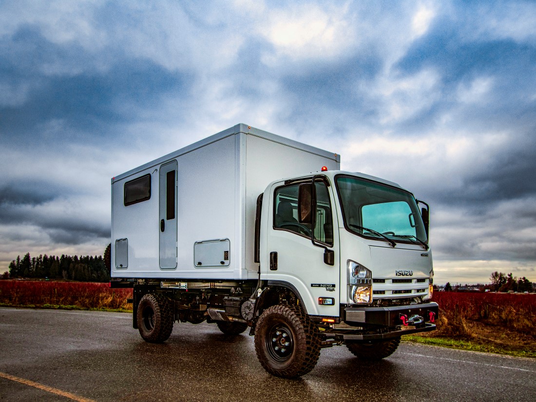 “A 2015 NPR with low miles. Professionally built, brand new 4×4 conversion (with Warn locking hubs and Eaton locker front axle), and a beautiful four-season composite lightweight camper box; loaded with extras. This is not a cheap build; it’s an expensive quality build. All the hard work is done, and it’s ready for your finishes.”