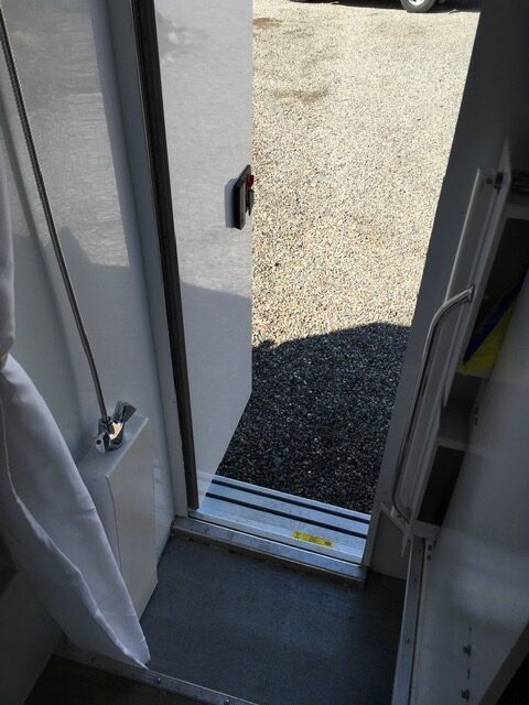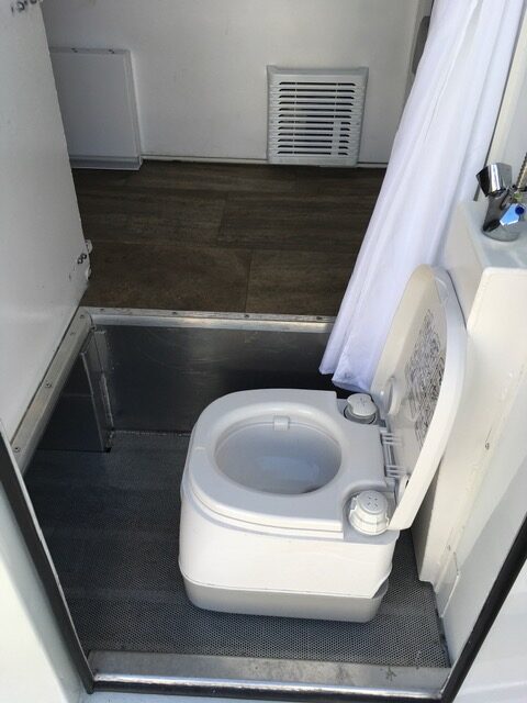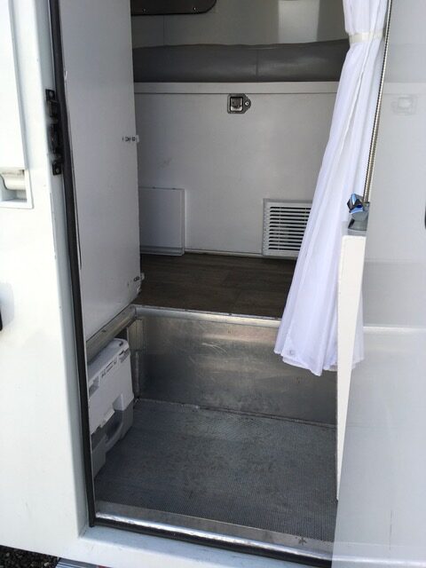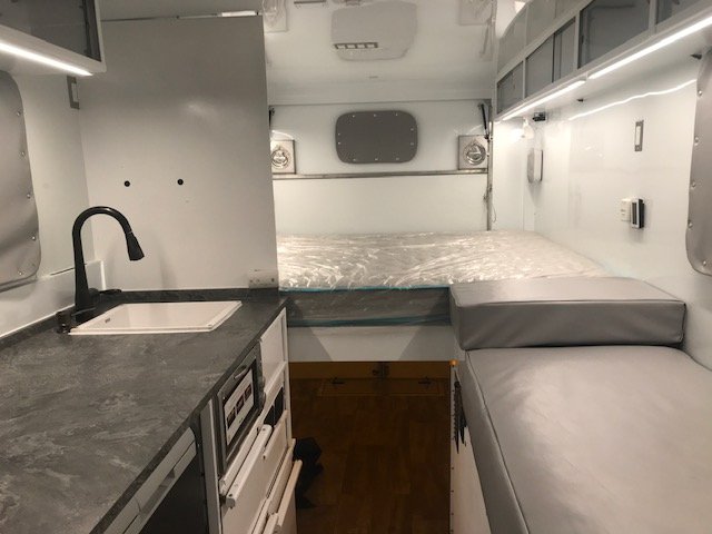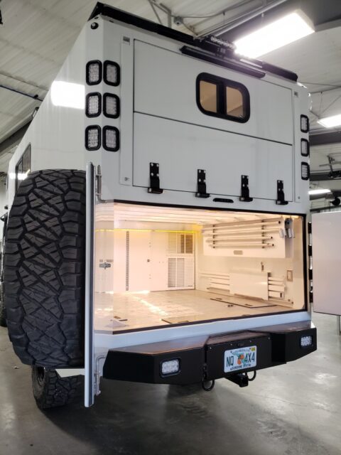 So with that out of the way, let’s move on to the camper itself. Whoever did the design of this camper really managed to incorporate every overlander bucket list feature. Two fridges? Check. Large passthrough? Check. Bathroom in the entryway? Check. Scheel-Mann seats? Check. Extreme cold insulation? Check. Seating for four and two California king-size beds? Check. And storage for surfboards, bicycles, and/or an inflatable boat? Check, too!