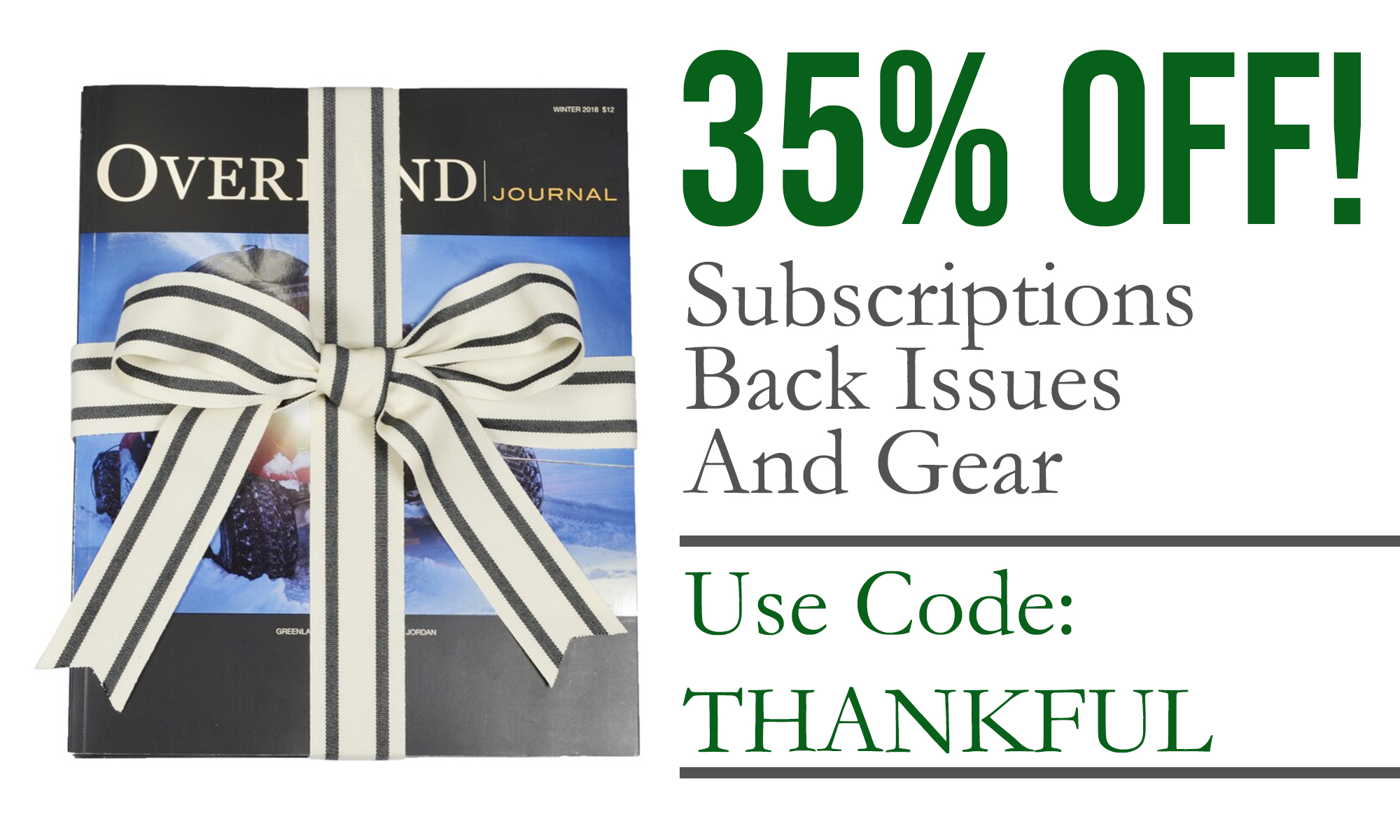 For 2020, we are offering 35% off everything in the store, including the ultimate overlander gift of our Lifetime Subscriber program. We are also extending the offer to our regular subscriptions, all of our Expedition Portal gear, and our 12 years of back issues (some back issues are no longer available).