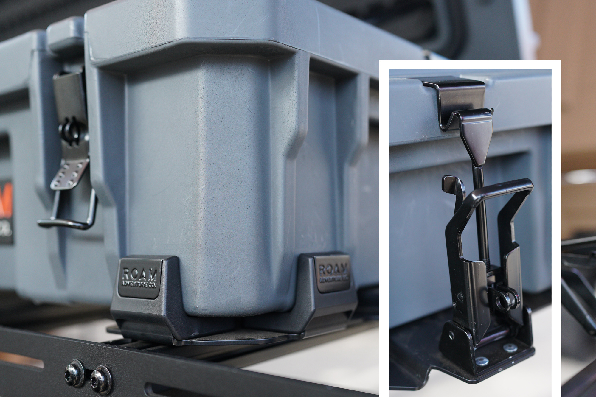 Roam Adventure Co. manufactures durable weatherproof cases, but up until now, they didn’t have an engineered solution for mounting them to your rig. This led to many customers drilling through them or using ratchet straps. Realizing the need for a better solution, Roam designed a mounting system that makes vehicle integration much easier. The mounts are comprised of a base plate that secures to your roof rack and a bracket that slips into the webbing channel on the cases. The brackets can be locked once the cases are attached, keeping your gear secure on your roof rack or wherever else you decide to mount them.