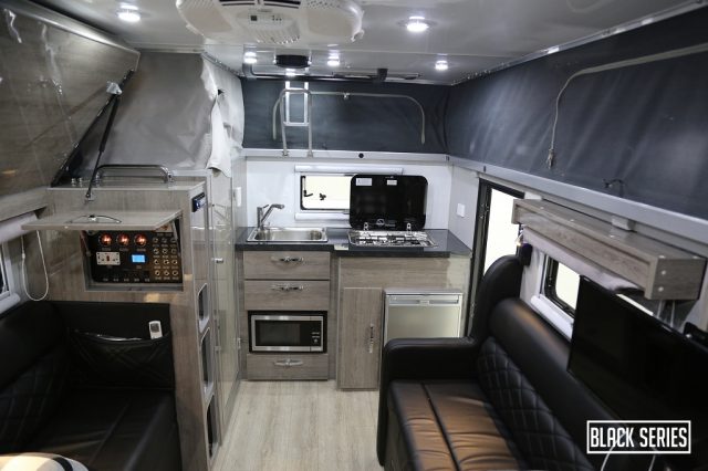 The Enduro prototype trailer is a new addition to the Lance Camper range and has the capability to travel across most off-road routes or while being towed by a small-sized SUV. The Enduro is large and robust, with a wedge-shaped posterior. It almost seems as if it was cut short on its hind legs, but this camper trailer weighs only 2,700 pounds, half of that of the Black Series HQ12. The interior has a dinette that sleeps two, and a bunk bed drops down to sleep an additional two people. The 2-person rooftop tent provides another option, making a grand total of six sleeper spaces. There is a fully kitted kitchen on the exterior along with solar, a lithium system, and for those extended off-grid stays, a water purification system. It might be a tight squeeze for six people sitting around the dinette, but if you’re interested in using your daily SUV, then this might be a good option.