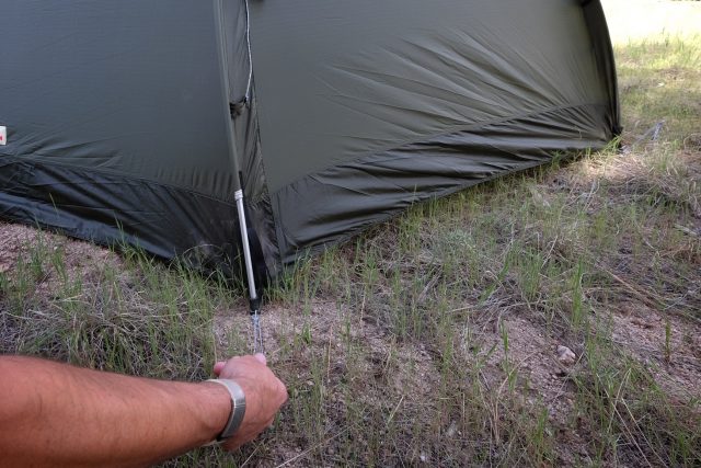 When placing a tent peg in the ground, always drive it at roughly a 45-degree angle. That will provide optimal mechanical leverage to keep it in the ground. Where to place the peg in relation to the tent body is important. A quick rule of thumb is to place the peg in line with the seam bearing most of the tension, not off to one side or the other. One trick is to place the pegs at all of the corners loosely, then once the tent body is positioned, go back around and drive them in the ground with full tension on the tent body. If you can, drive them all the way into the ground to reduce the trip hazard.