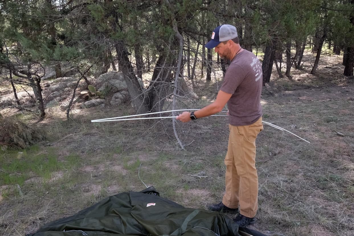 At this point, most tents will require you to connect the poles to the appropriate corners, then attach the tent body to those poles via clips or sleeves. Once completed, add the fly.
