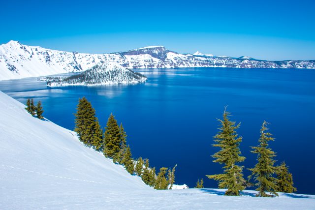 At 1,943 feet deep, Crater is the deepest lake in the United States and widely considered to be the purest in the world. Its isolation inside a volcanic caldera has ensured its preservation over thousands of years, and an exclusive, steady replenishment of its water supply by rain and snowmelt will likely help it endure for thousands more. Yet most people don’t recognize this lake for its purity, but for its beauty. Crater’s deep sapphire waters are legendary, and the high cliff walls surrounding them act as a visual barrier, dividing the stunning blue of the water from that of the sky. If you reach the park in the summer months you’ll find camping, biking, hiking, swimming, and a wide array of other activities to enjoy. If you arrive when there is snow on the ground, options are more limited, but there is still plenty to see and do—try snowshoeing around the rim. Crater Lake is at its best when the brilliant blue water is backed by pure white snow.