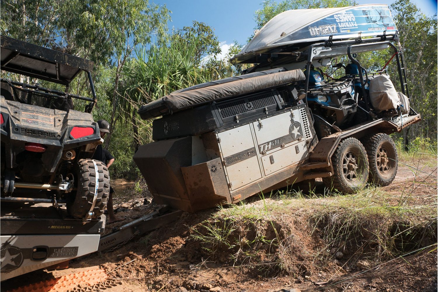 The front storage compartment of the TT730 is designed for hauling recovery gear, racing equipment, a DC refrigerator, jerry cans, and up to 115 liters of water (with an optional upgrade). Standard features include PCOR 17-inch alloy wheels, MaxTrax mounts, vehicle ramps, DO35 hitch coupling, 12-inch electric brakes, airbag suspension, and more. Check out the full TT730 specs.