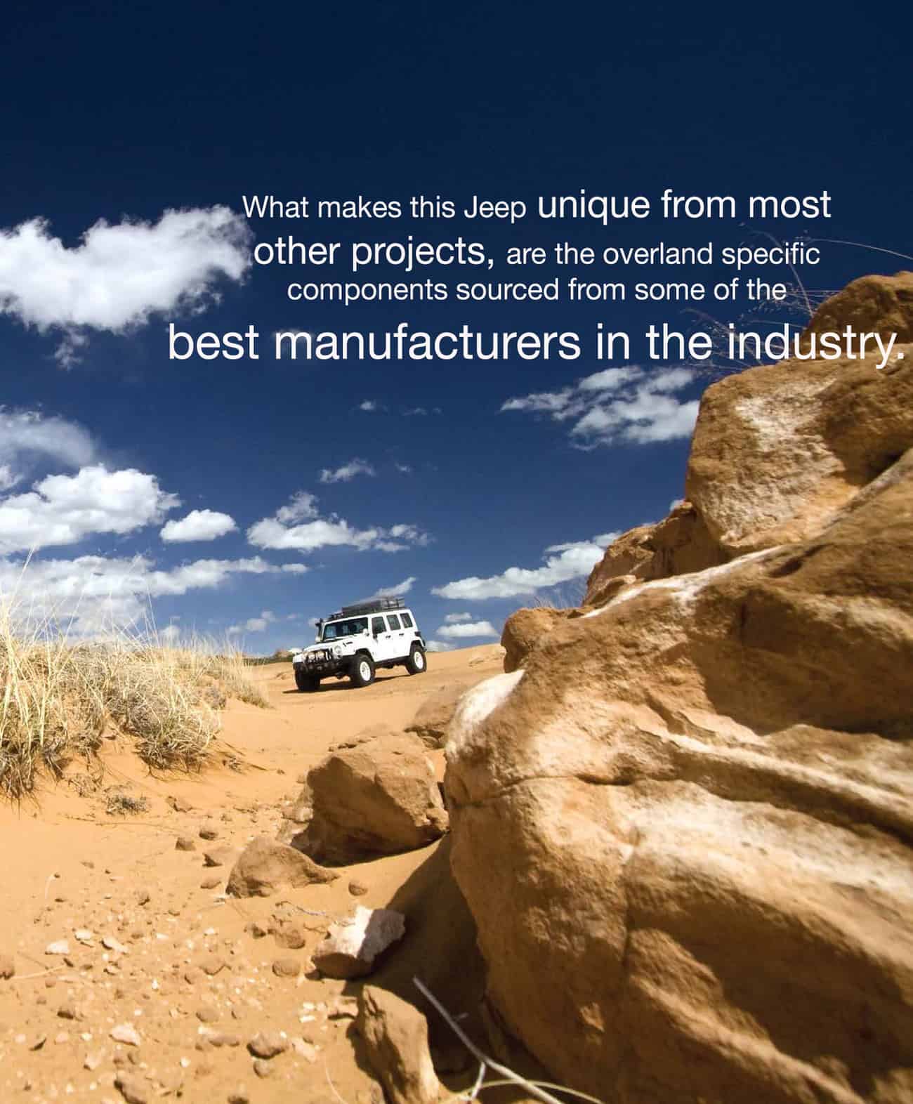 Jeep’s Chief Designer Mark Allen is responsible for the elegant lines of the new Grand Cherokee and the purposeful nature of the new Wrangler. In 2008, Mark and his Skunkworks team decided on two significant endeavors for their show vehicles. First, was that every vehicle must work on the trail and set a new standard in Jeep performance. Second, to build a legitimate overland vehicle; something that could be packed with a few essentials and driven around the world. The result was the Overland JK. Unveiled at the 2008 Moab Easter Jeep Safari, it was ultimately featured in dozens of print publications and in a prime-time television show.